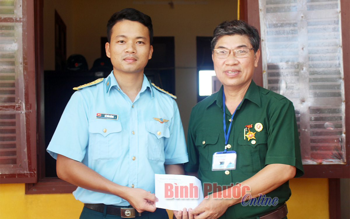 Thành viên đoàn công tác tỉnh Bình Phước tặng quà đại úy Lê Văn Hùng, chính trị viên Trạm rada 57, Quân chủng phòng không không quân trên đảo Nam Yết