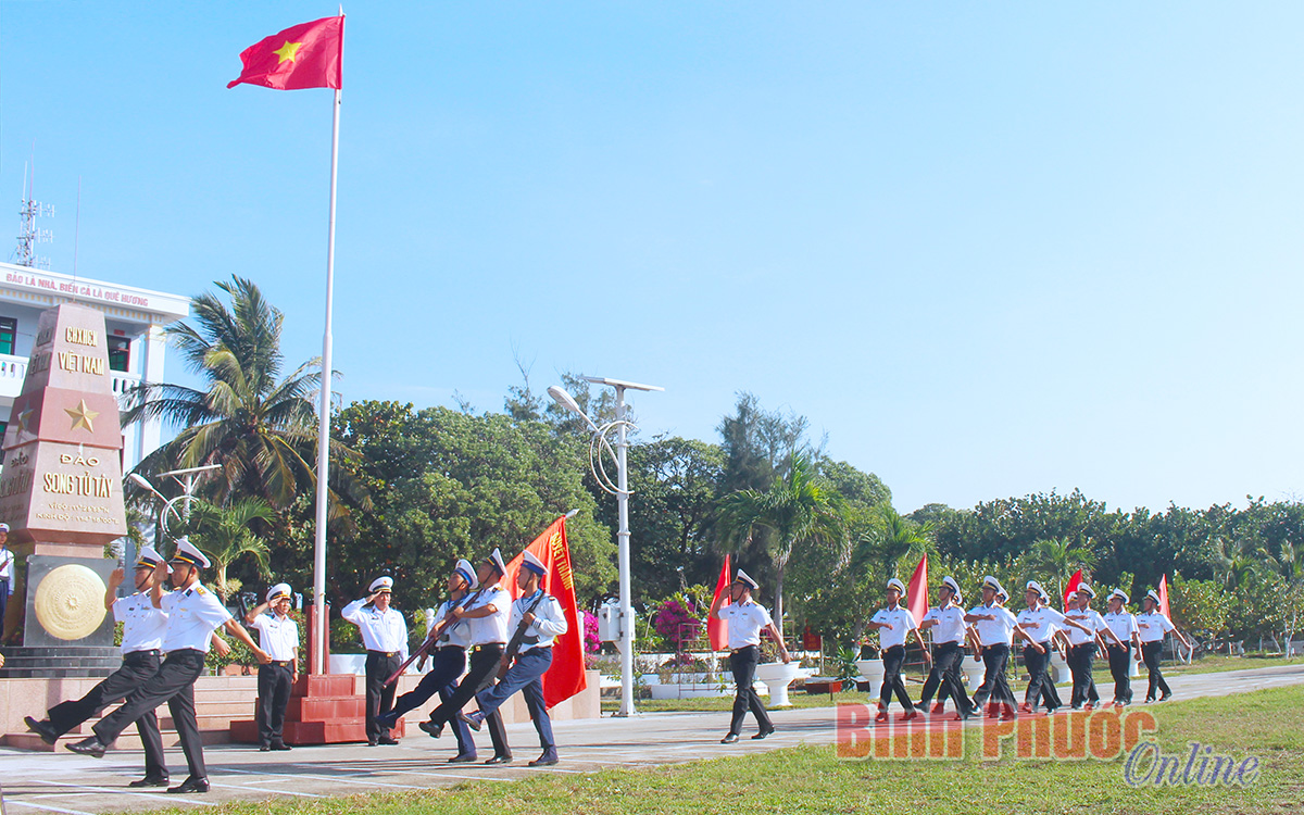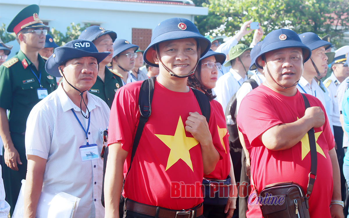 Các thành viên Đoàn công tác tỉnh Bình Phước tham dự lễ chào cờ tại đảo Song Tử Tây