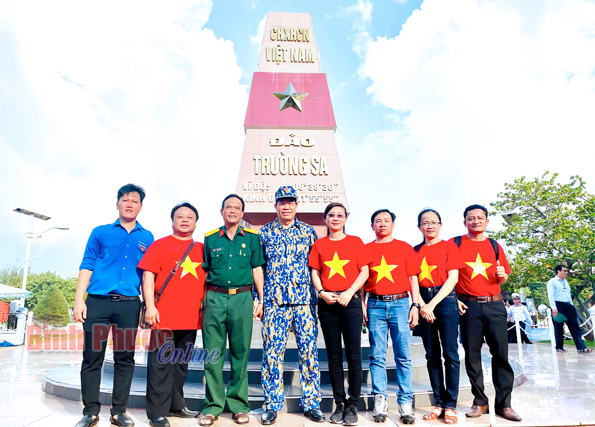 Đoàn công tác tỉnh Bình Phước chụp hình lưu niệm cùng Phó tư lệnh Quân chủng Hải quân, Trưởng đoàn công tác số 4 Phan Tuấn Hùng tại cột mốc chủ quyền ở thị trấn Trường Sa - Ảnh chụp trước ngày 27-4-2021