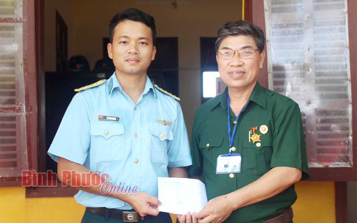 Đại diện đoàn công tác tỉnh Bình Phước tặng quà động viên Đại úy Lê Văn Hùng