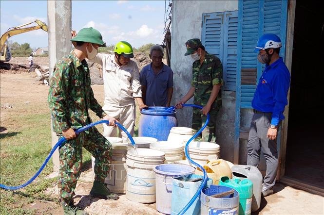 Tuổi trẻ BĐBP hỗ trợ nước sạch cho người dân vùng hạn mặn. Ảnh: TTXVN phát