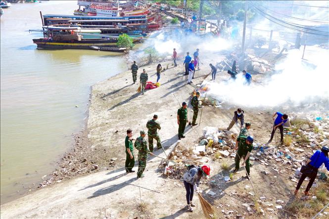 Tuổi trẻ BĐBP chung tay làm sạch biển. Ảnh: TTXVN phát