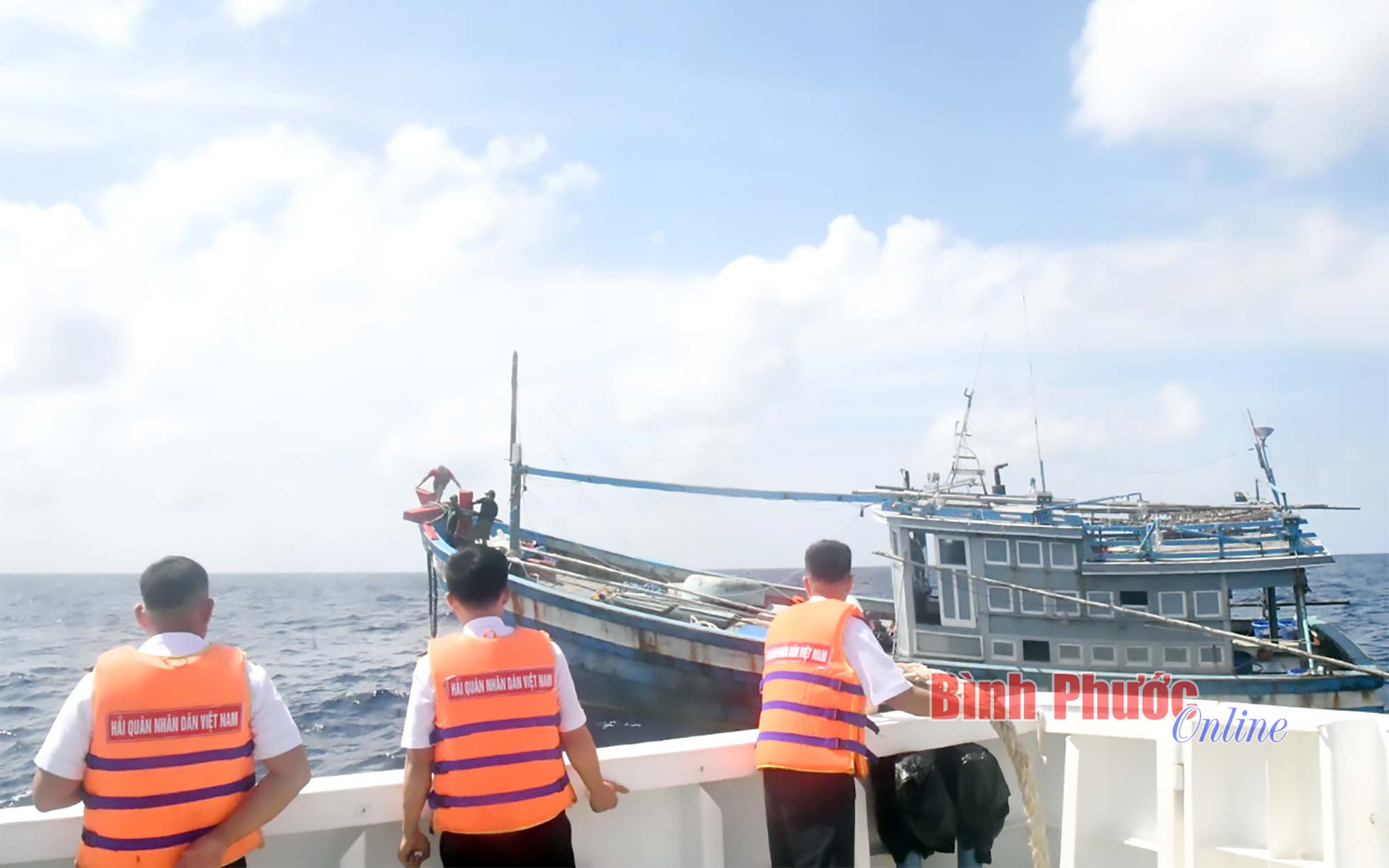 Tàu 471 đang lai kéo tàu cá KH 98246 TS về Đá Tây để sửa chữa.