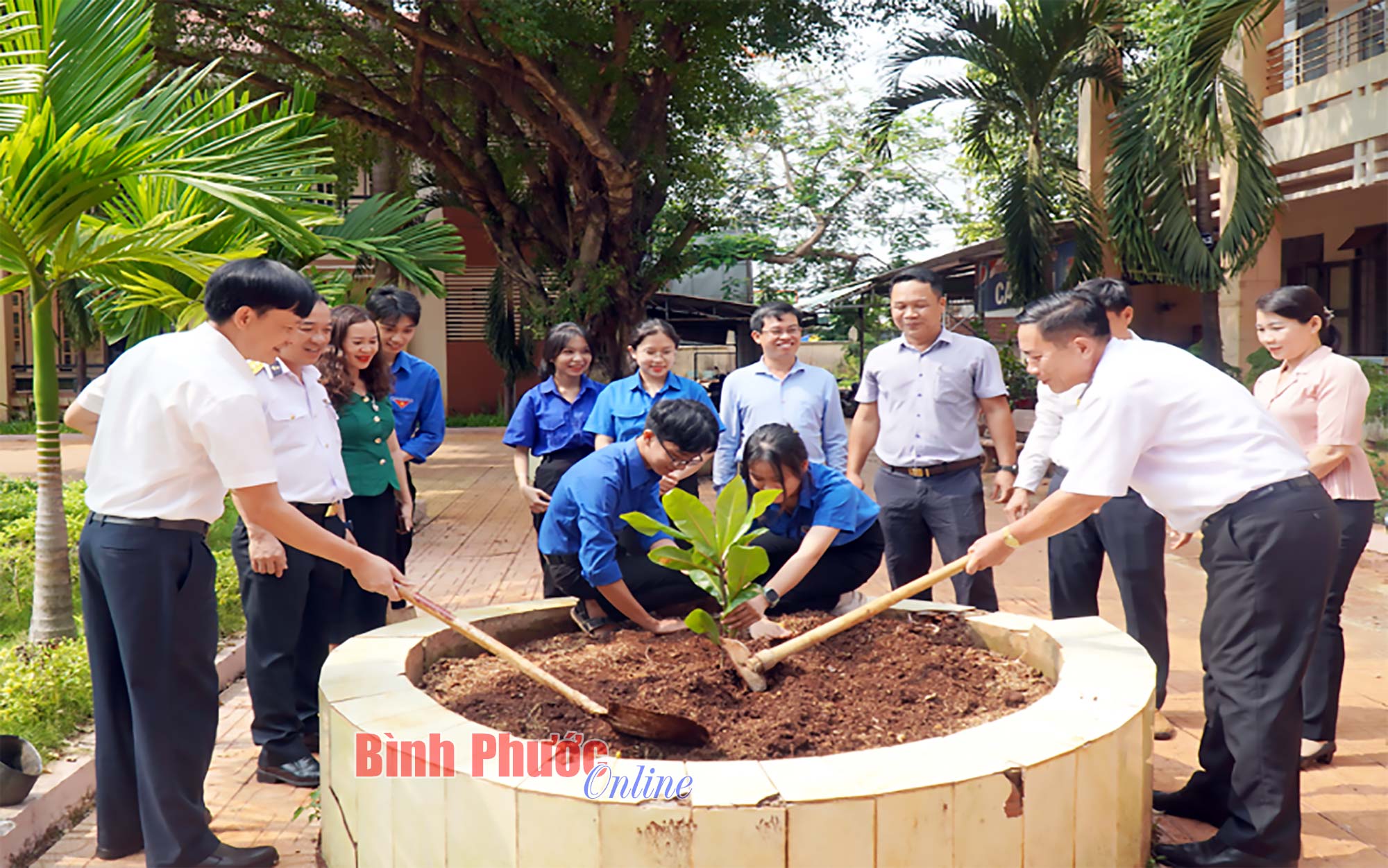 Đại tá Đào Giang Hải, Phó Chủ nhiệm chính trị Bộ Tư lệnh Vùng 4 Hải quân; Chủ tịch UBND huyện Phú Riềng Lê Anh Nam cùng Ban giám hiệu và các em học sinh Trường THPT Nguyễn Khuyến trồng cây bàng vuông lưu niệm