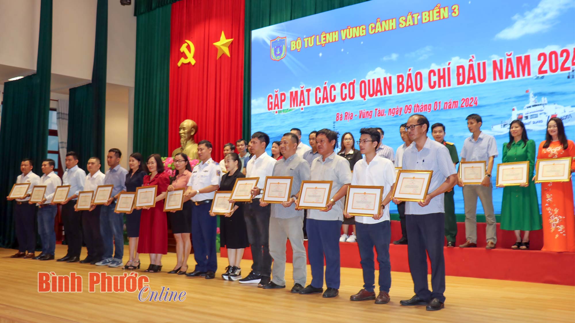 Tại buổi gặp mặt, Bộ Tư lệnh Vùng Cảnh sát biển 3 đã tặng giấy khen cho 28 tập thể, 50 cá nhân thuộc các cơ quan tuyên giáo, báo chí trên địa bàn vì đã có thành tích xuất sắc trong công tác phối hợp tuyên truyền biển đảo, lực lượng cảnh sát biển năm 2023.