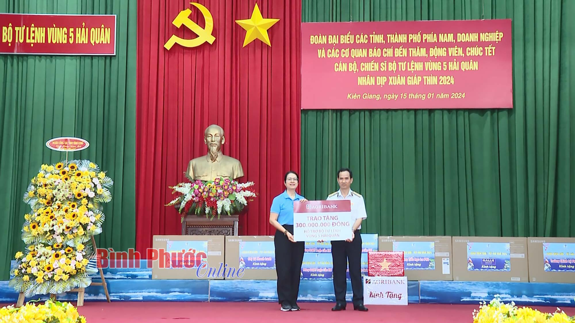 Chuẩn đô đốc Nguyễn Hữu Thoan, Chính ủy Bộ Tư lệnh Vùng 5 Hải quân đón nhận tình cảm, quà tặng của các tỉnh, thành, đơn vị, tổ chức, cá nhân tại chương trình