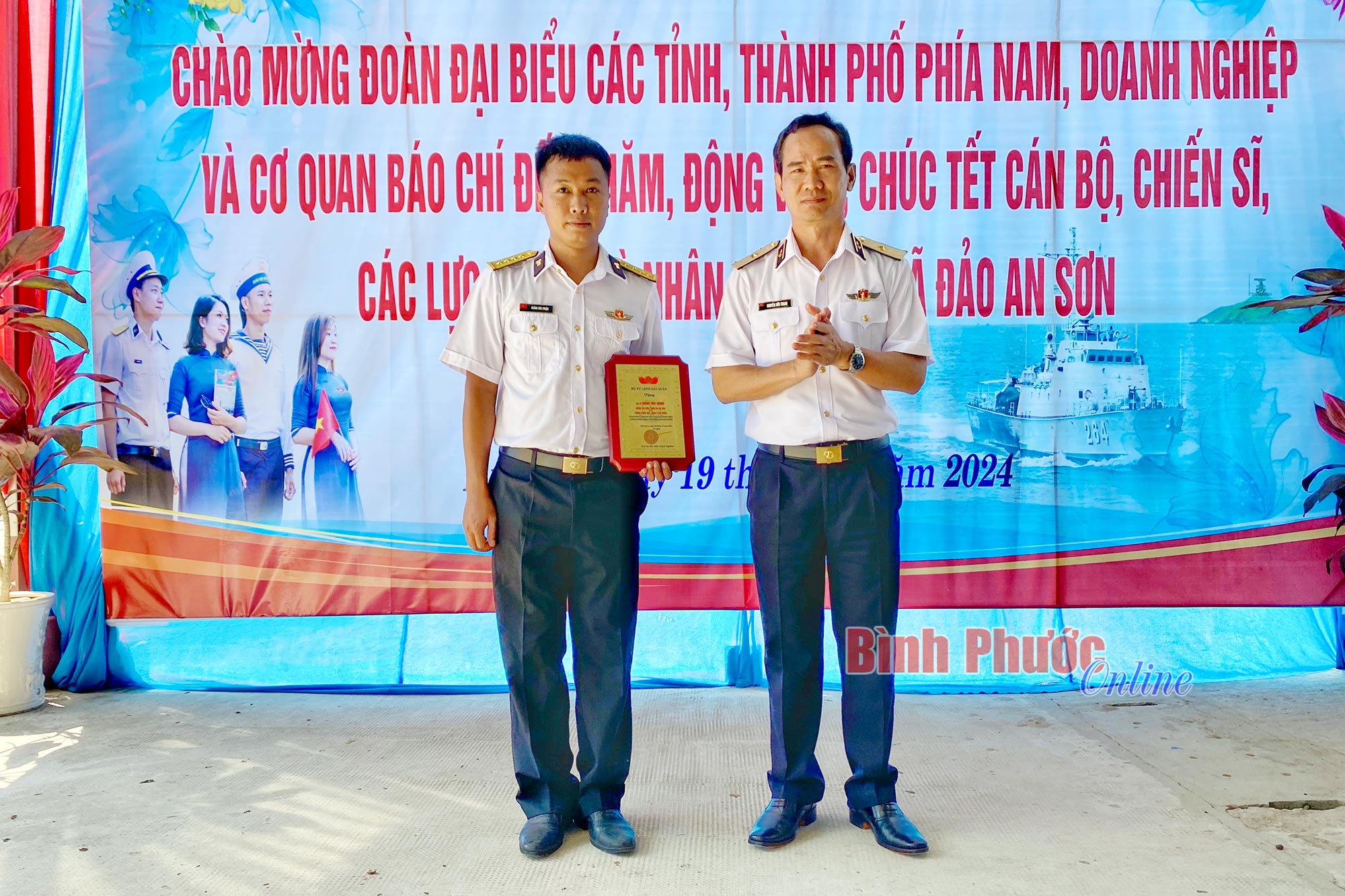 Chuẩn đô đốc Nguyễn Hữu Thoan, Chính ủy Bộ Tư lệnh Vùng 5 Hải quân trao danh hiệu “Chính trị viên trạm ra đa tiêu biểu xuất sắc nhất Quân chủng Hải quân” cho Đại úy Hoàng Văn Thuận, Chính trị viên Trạm ra đa 600