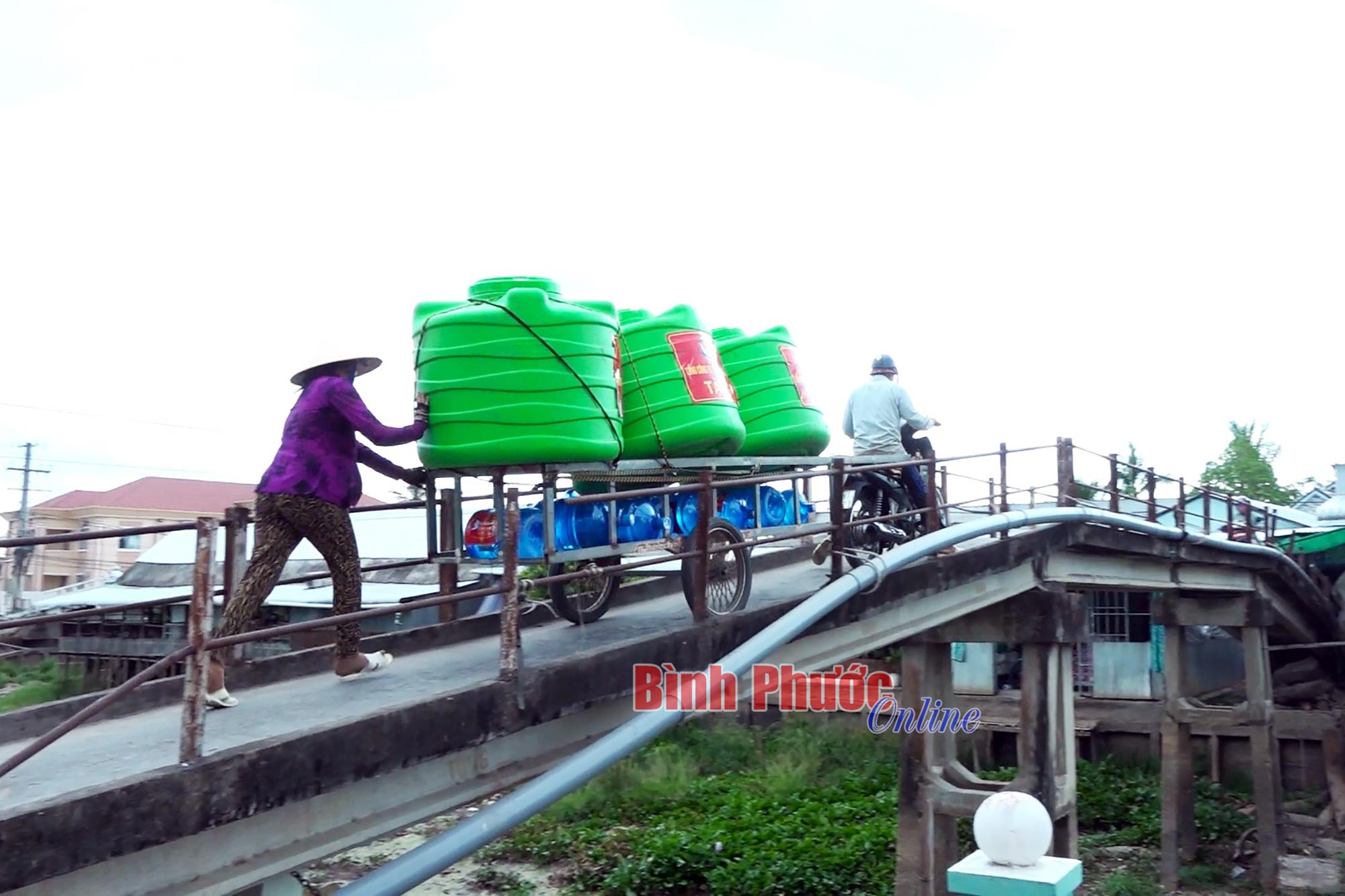 Người dân phấn khởi chở bồn chứa nước và nước lọc tinh khiết về nhà