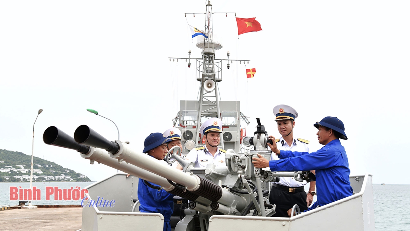Thượng tá Mai Đăng Danh (thứ 2 từ phải qua) kiểm tra công tác bảo quản vũ khí trên Tàu 251, Hải đội 512, Lữ đoàn 127