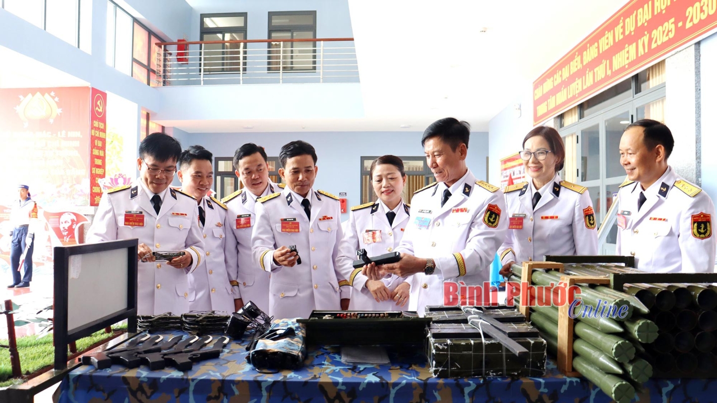 Đại tá Đỗ Hồng Duyên và các đại biểu tham quan mô hình, học cụ nâng chất huấn luyện được trưng bày tại đại hội