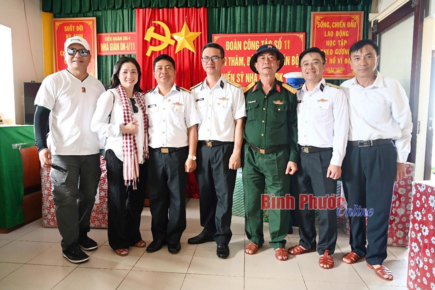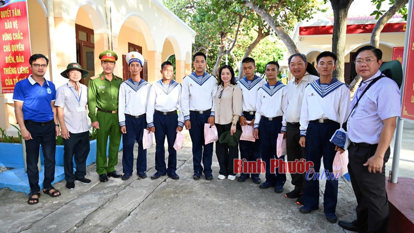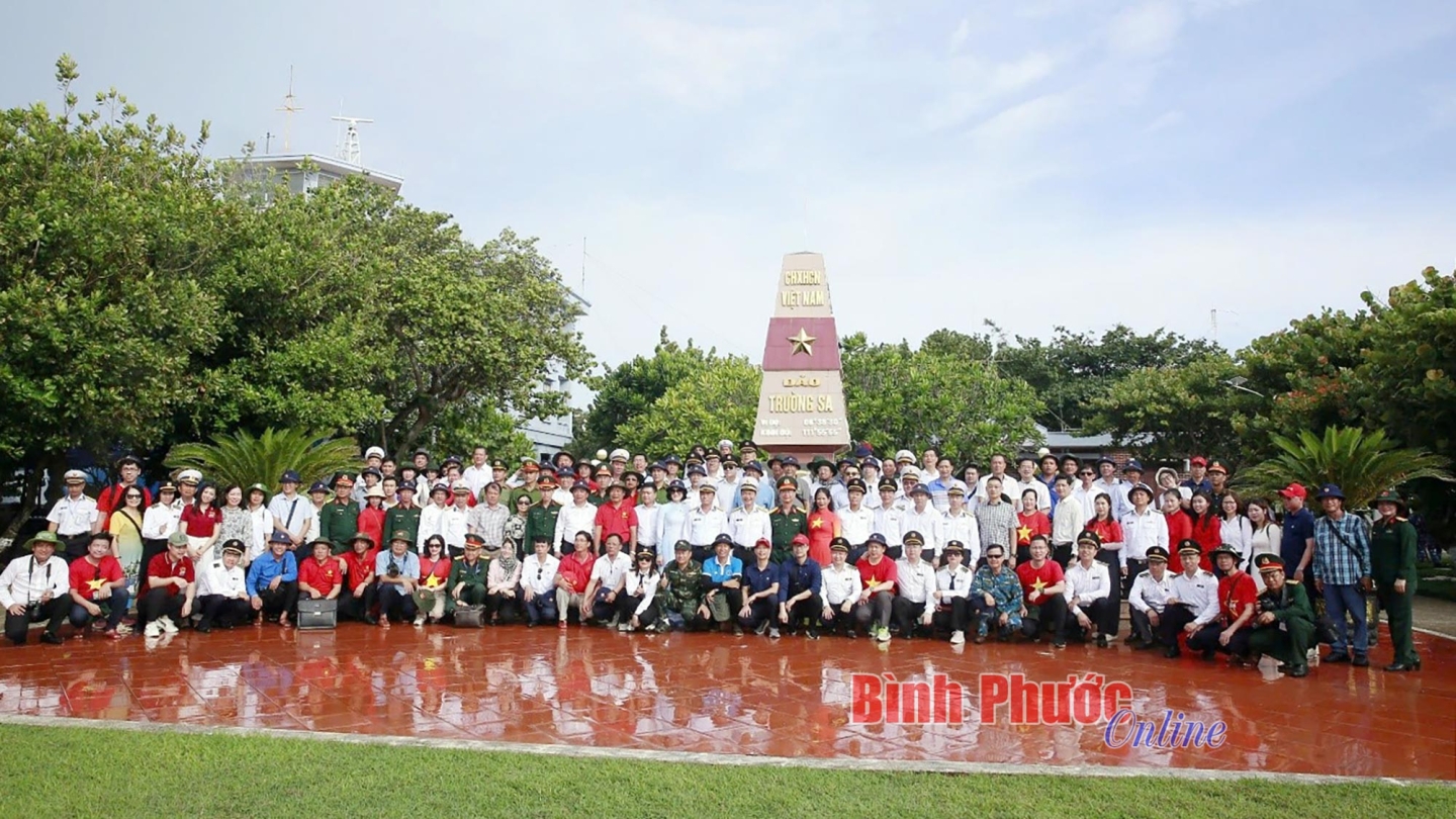 Các thành viên Đoàn công tác tỉnh Bình Phước chụp hình cùng cán bộ, chiến sĩ trên các điểm đảo
