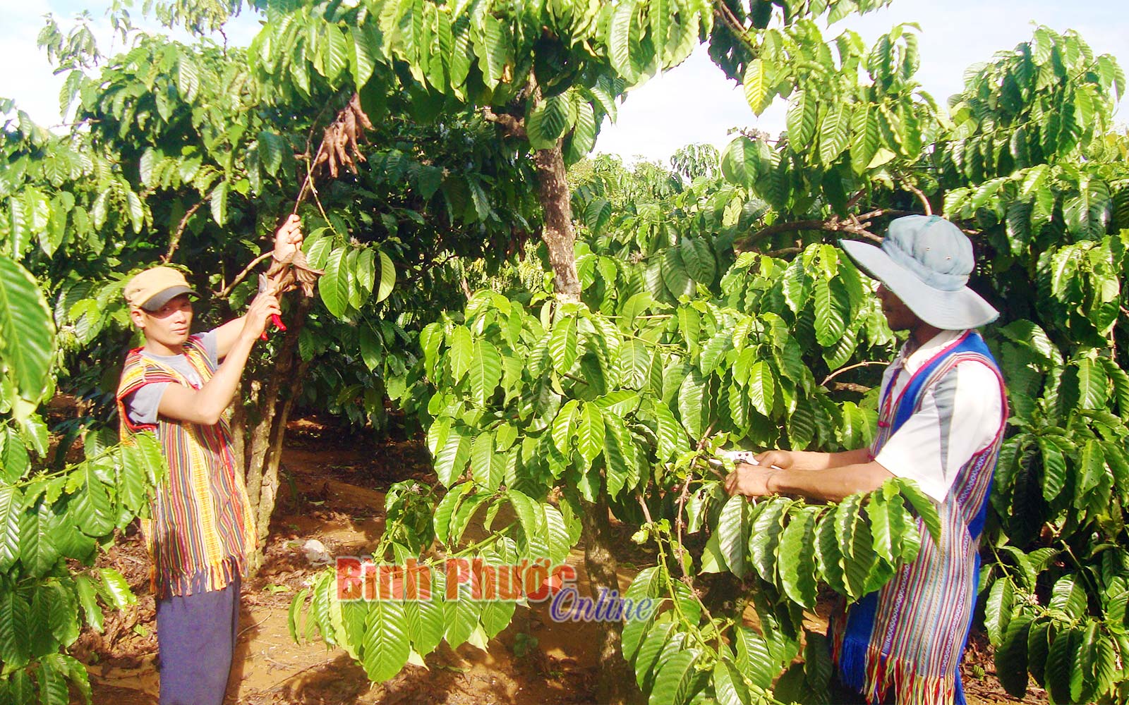Anh Điểu Ma Rơn (trái) chăm sóc vườn cây nhận khoán của Trung đoàn 719 Binh đoàn 16