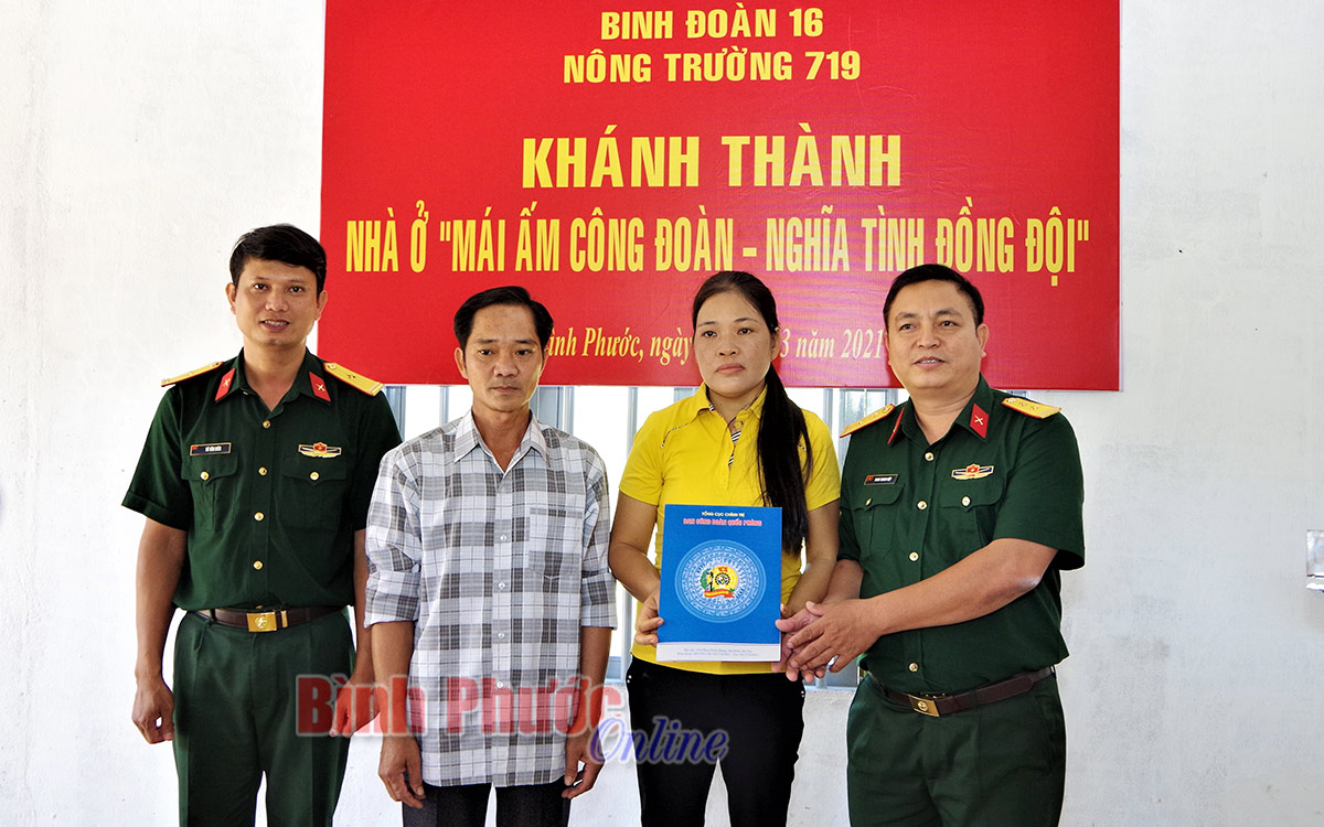 Đại diện công đoàn, Binh đoàn 16 trao quyết định hỗ trợ kinh phí xây dựng cho gia đình chị Bùi Thị Thắm