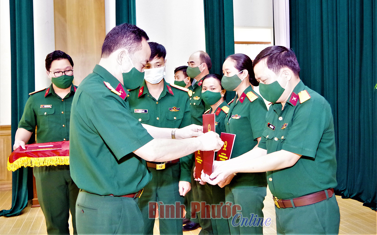 Đại tá Lê Quang Sáu, Bí thư Đảng ủy, Phó tư lệnh Binh đoàn trao quyết định cho các cán bộ, sĩ quan được thăng quân hàm cấp bậc trung tá
