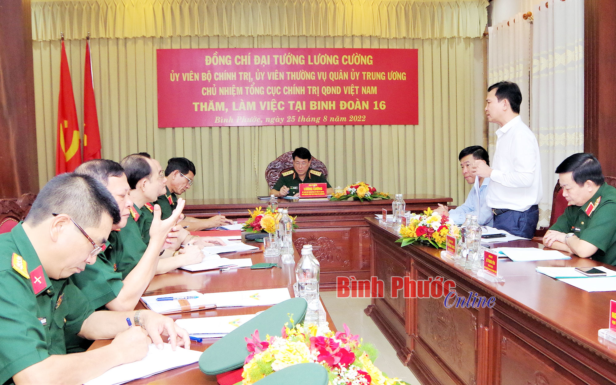 Phát biểu tại buổi làm việc, Đại tướng Lương Cường đánh giá cao những kết quả cán bộ, chiến sĩ, người lao động Binh đoàn 16 đã đạt được qua hơn 24 năm xây dựng, hình thành và phát triển. Đồng thời đề nghị, trong những tháng cuối năm 2022, Thường vụ Đảng ủy Binh đoàn cần tập trung lãnh đạo, chỉ đạo thực hiện tốt nhiệm vụ, hoàn thành các kế hoạch, mục tiêu đề ra; phát huy tốt những bài học, kinh nghiệm, bám sát chức năng nhiệm vụ, xây dựng đơn vị trong sạch vững mạnh theo tiêu chuẩn mới; xây dựng, tổ chức đơn vị tinh gọn, mạnh, hoạt động hiệu quả, trở thành chỗ dựa vững chắc cho nhân dân, góp phần cùng cấp ủy, chính quyền địa phương các cấp ở địa bàn đứng chân giữ vững quốc phòng - an ninh, phát triển kinh tế - xã hội; nâng cao công tác chăm lo đời sống tinh thần, vật chất cho cán bộ, công nhân viên, người lao động, gia đình chính sách, hộ nghèo, địa bàn tôn giáo, dân tộc.