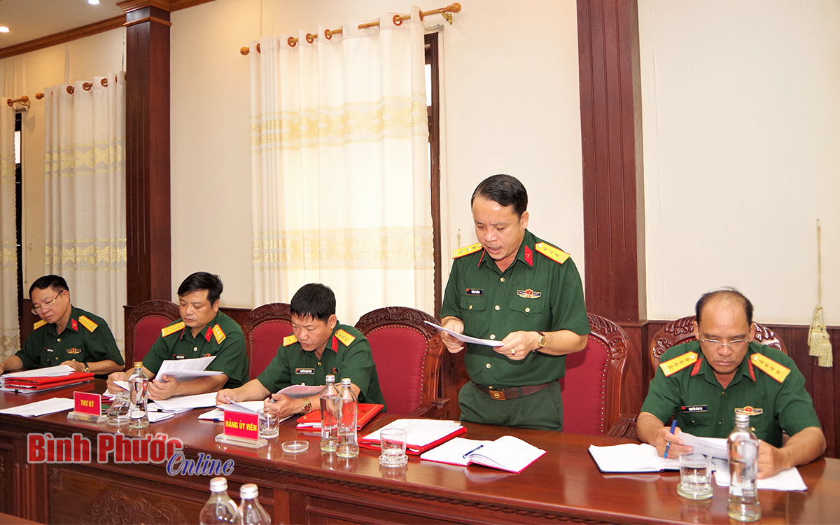 Đại diện Trung đoàn 717 báo cáo tham luận về nhiệm vụ phát triển kinh tế - xã hội gắn với củng cố quốc phòng - an ninh trên địa bàn biên giới huyện Bù Đốp