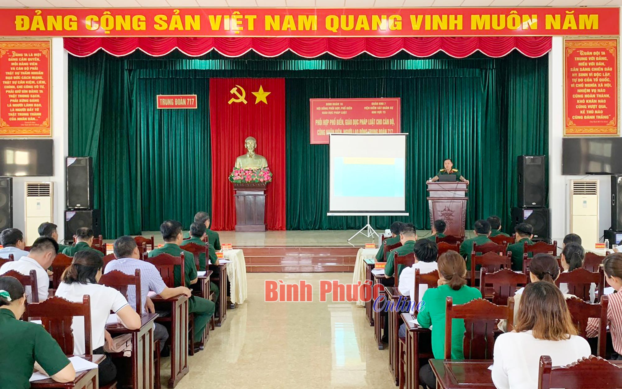 Cán bộ, công nhân viên và người lao động Trung đoàn 717 tham dự hội nghị phổ biến, giáo dục pháp luậtTại hội nghị, các báo cáo viên của Viện Kiểm sát quân sự khu vực 73, Quân khu 7 đã phổ biến các chuyên đề: Tình hình vi phạm, tội phạm xảy ra trong toàn quân và lực lượng vũ trang Quân khu 7, biện pháp phòng ngừa; tình hình vi phạm an toàn giao thông đường bộ trong lực lượng quân đội, Quân khu 7 và các quy định về bảo đảm an toàn khi tham gia giao thông…