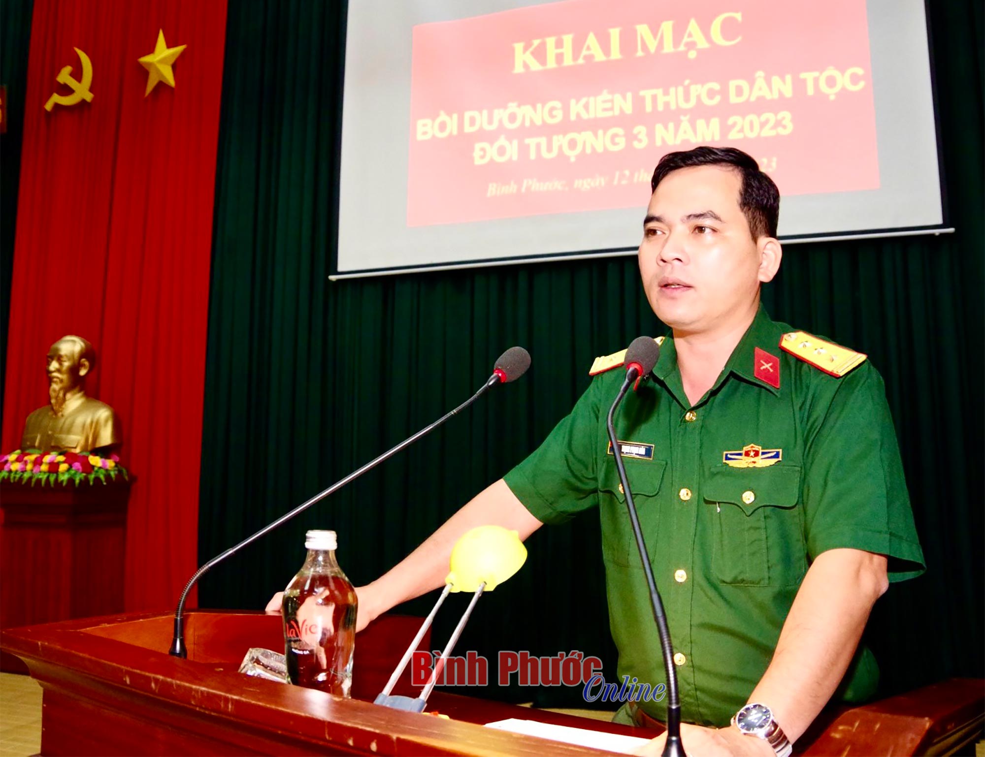 Theo chương trình, trong thời gian 5 ngày (từ ngày 12 đến 16-12), các học viên sẽ được các báo cáo viên của Ban Dân tộc tỉnh Bình Phước và Binh đoàn 16 truyền đạt 6 chuyên đề về tổng quan các dân tộc Việt Nam, bản sắc văn hóa các dân tộc thiểu số, những cơ chế, chính sách đặc thù của Đảng và Nhà nước đối với từng dân tộc, từng địa bàn, vùng miền; công tác quốc phòng, an ninh ở vùng đồng bào dân tộc thiểu số và một số nội dung của Chương trình mục tiêu quốc gia phát triển kinh tế - xã hội vùng đồng bào dân tộc thiểu số và miền núi giai đoạn 2021-2025.