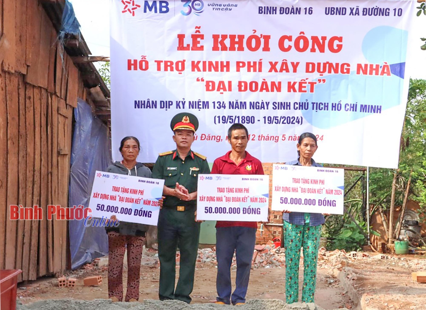 Từ đầu năm 2024 đến nay, Binh đoàn 16 đã huy động các nguồn lực hỗ trợ kinh phí, khởi công xây dựng 4 căn nhà thuộc huyện Đồng Phú, tỉnh Bình Phước; 7 căn thuộc tỉnh Đắk Nông; đã bàn giao 5 căn nhà đồng đội trên địa bàn tỉnh Đắk Nông. Theo kế hoạch, trong năm 2024, Bộ Tư lệnh Binh đoàn 16 sẽ triển khai xây dựng và bàn giao 23 căn nhà đại đoàn kết cho người dân thuộc 2 tỉnh Bình Phước và Đắk Nông.
