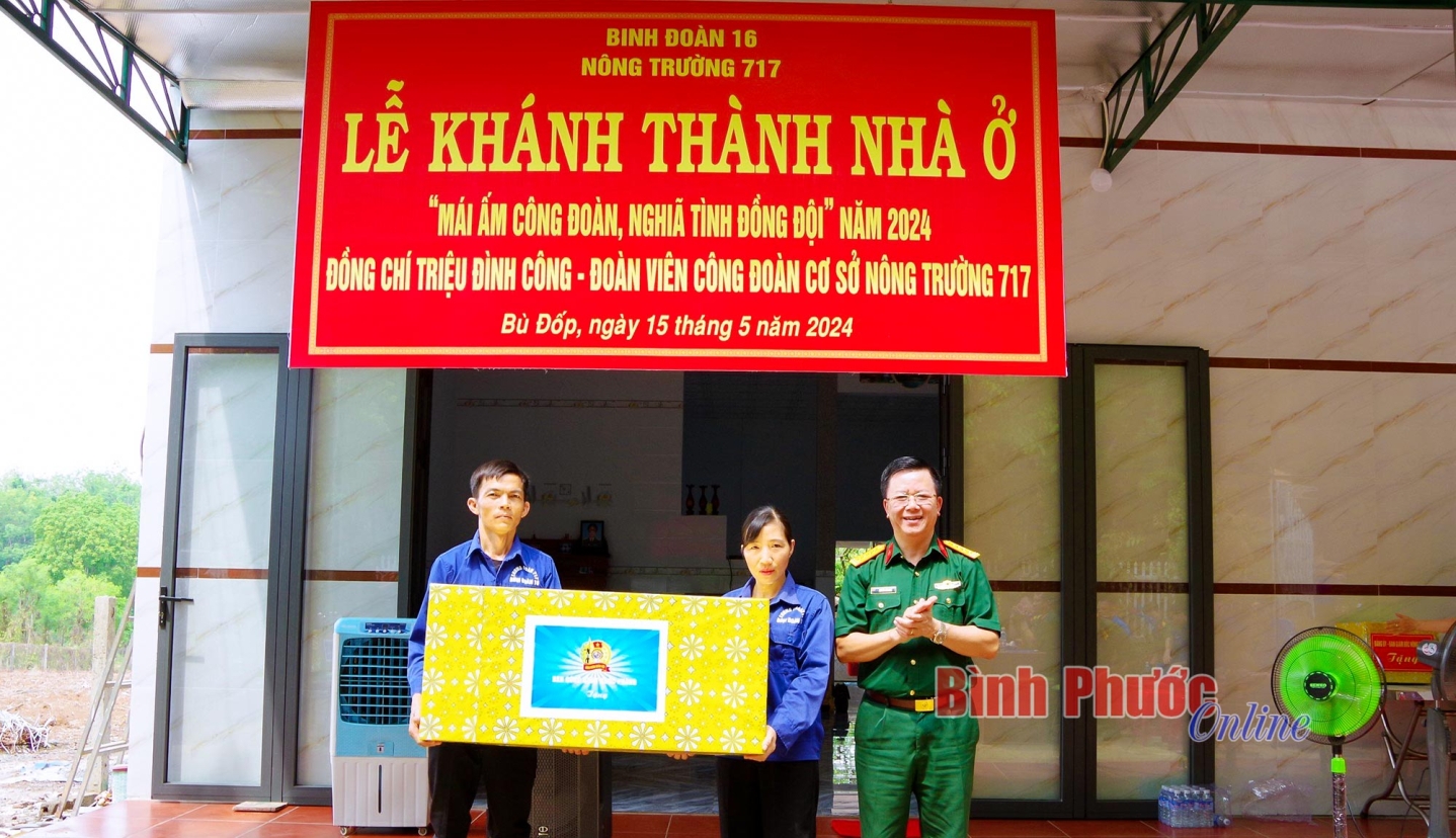Đoàn công tác đã tổ chức khánh thành và bàn giao kinh phí hỗ trợ xây dựng nhà “mái ấm công đoàn, nghĩa tình đồng đội” cho gia đình anh Triệu Đình Công, công nhân Đội sản xuất 2, Trung đoàn 717, còn khó khăn về nhà ở. Tổng kinh phí xây dựng gần 310 triệu đồng, trong đó Ban Công đoàn Quốc phòng hỗ trợ 80 triệu đồng, số còn lại gia đình vay mượn và tiết kiệm được.