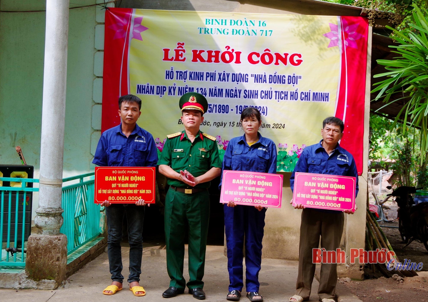 Trong dịp này, Binh đoàn 16 cũng tổ chức lễ khởi công và trao tặng kinh phí hỗ trợ xây dựng 5 căn “nhà đại đoàn kết” cho các hộ nghèo, khó khăn về nhà ở trên địa bàn các xã Hưng Phước, Tân Tiến, Thiện Hưng (huyện Bù Đốp) và xã Lộc An, Lộc Hòa (huyện Lộc Ninh). Mỗi căn được hỗ trợ 50 triệu đồng từ nguồn vốn hỗ trợ của Ngân hàng TMCP Quân đội (MB).