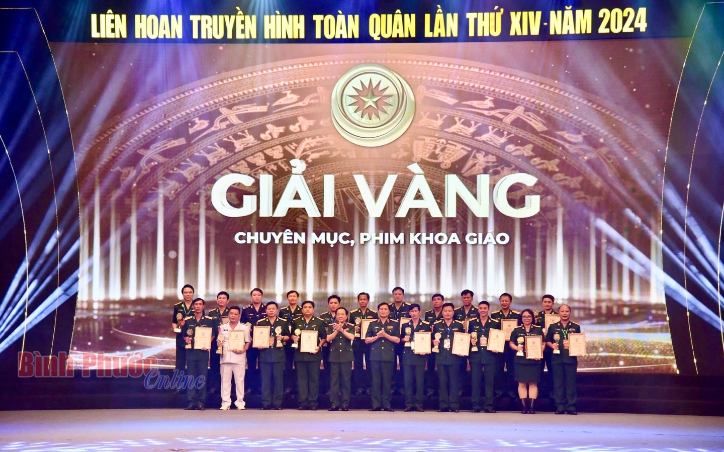 Thượng tướng Trịnh Văn Quyết, Chủ nhiệm Tổng cục Chính trị Quân đội nhân dân Việt Nam và Thượng tướng Nguyễn Tân Cương, Tổng Tham mưu trưởng Quân đội nhân dân Việt Nam, Thứ trưởng Bộ Quốc phòng chụp hình lưu niệm với các tác giả nhận giải Vàng thể loại chuyên mục và phim khoa giáo