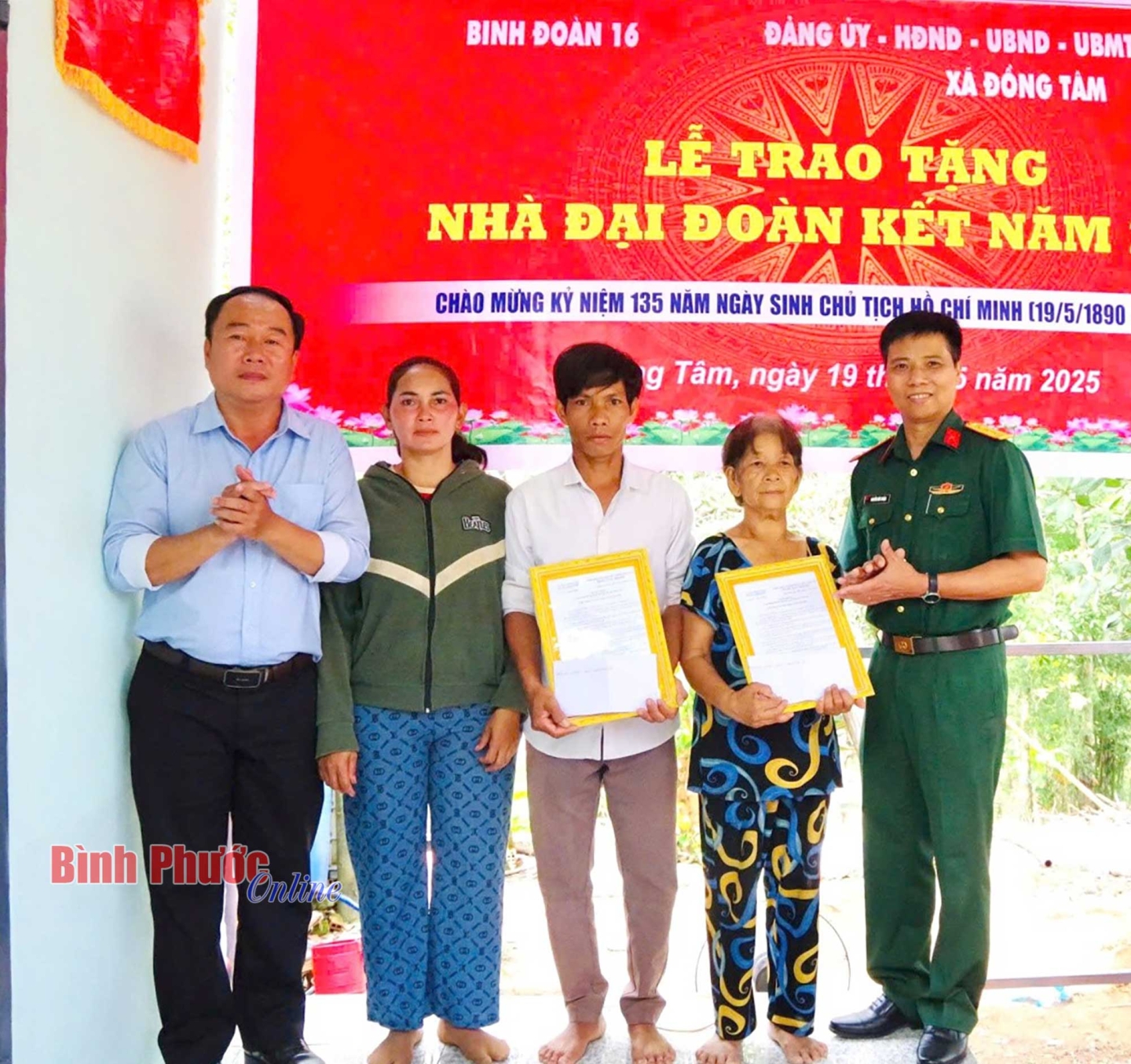 2 căn nhà đại đoàn kết được bàn giao cho gia đình bà Lê Thị Hai ở ấp 5 và anh Điểu Viên ở ấp 1, xã Đồng Tâm. Căn nhà được hoàn thành với kết cấu vững chắc, có 1 phòng ngủ, 1 phòng khách và 1 gian bếp, nhà vệ sinh khép kín với tổng trị giá hơn 100 triệu đồng. Trong đó, Binh đoàn 16 hỗ trợ kinh phí xây dựng 60 triệu đồng/căn, Quỹ vì người nghèo xã Đồng Tâm hỗ trợ 10 triệu đồng/căn. Số tiền còn lại gia đình, người thân góp thêm để căn nhà được khang trang hơn.