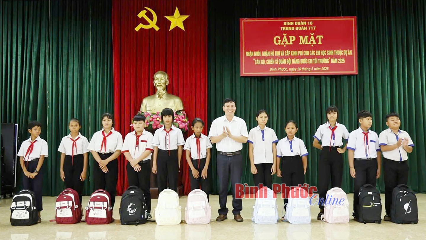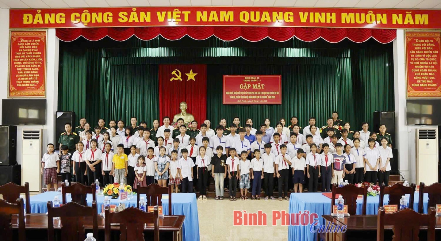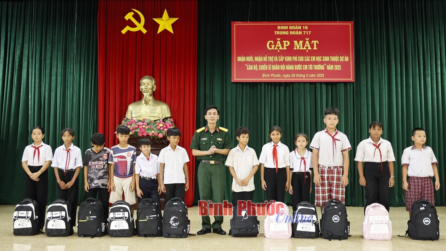 Thiên Kim chỉ là một trong số rất nhiều học sinh dân tộc thiểu số (DTTS) khó khăn trên địa bàn các huyện biên giới Bù Đốp, Lộc Ninh được Trung đoàn 717 nhận nuôi, hỗ trợ kinh phí vươn lên trong học tập. Thượng tá Vũ Hữu Việt, Bí thư Đảng ủy, Chính ủy Trung đoàn 717 cho biết: Từ năm 2022, trung đoàn triển khai thực hiện Dự án “Cán bộ, chiến sĩ quân đội nâng bước em tới trường” trên địa bàn đóng quân thuộc 8 xã của 2 huyện Lộc Ninh, Bù Đốp, tỉnh Bình Phước. Với đặc thù địa bàn có nhiều đồng bào DTTS sinh sống, đời sống nhân dân còn khó khăn nên khi dự án được triển khai thực hiện đã giúp các cháu học sinh DTTS, học sinh hoàn cảnh khó khăn có điều kiện được đến lớp học tập tốt, vươn lên trong cuộc sống. Từ năm 2022 đến nay, trung đoàn đã nhận nuôi, hỗ trợ kinh phí, phương tiện, dụng cụ học tập, tư trang cho các em với tổng gần 1,5 tỷ đồng.
