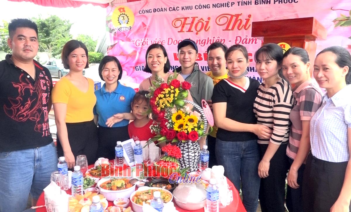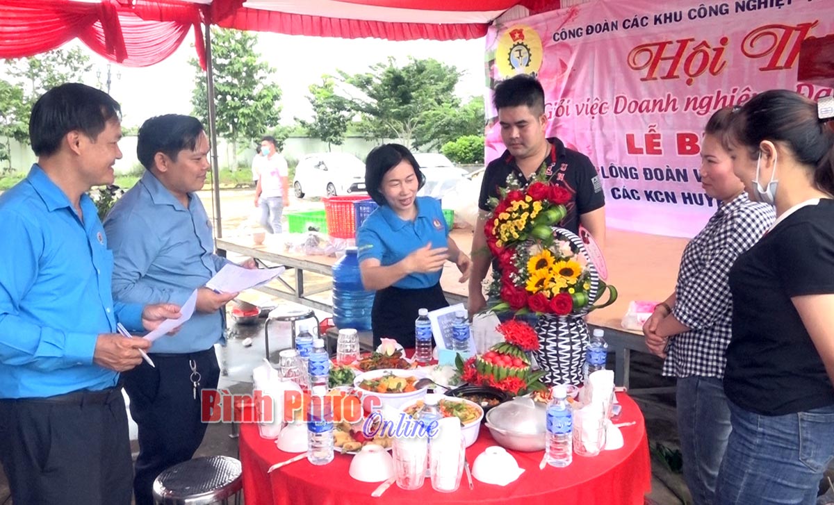 Ban giám khảo chấm điểm phần thi nấu ăn và cắm hoaHội thi có sự tham gia của 20 đội, với hơn 300 công nhân, lao động đến từ công đoàn các công ty, doanh nghiệp trong các khu công nghiệp của huyện Chơn Thành.