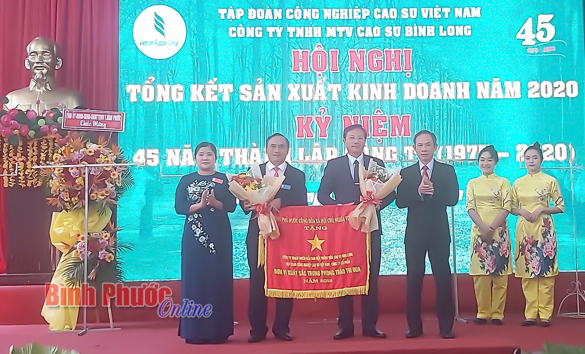 Dịp này, Công ty TNHH MTV cao su Bình Long đã vinh dự được nhận cờ thi đua của Thủ tướng Chính phủ. Nhiều tập thể, cá nhân Công ty đã được UBND tỉnh, Tập đoàn Công nghiệp cao su Việt Nam khen thưởng vì đã có thành tích xuất sắc trong năm 2020 cũng như những đóng góp tích cực trong 45 năm hình thành và phát triển công ty.