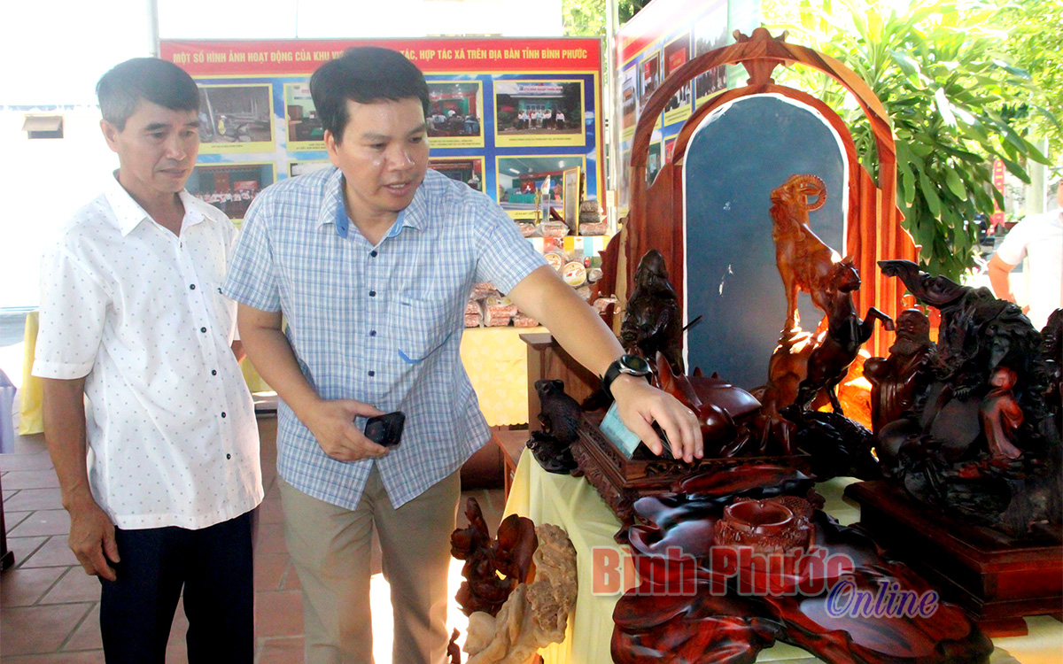 Ông Hà Văn Kiên, Chủ tịch Liên minh HTX (bìa phải) tham quan gian hàng đồ gỗ của HTX Mộc Chơn Thành