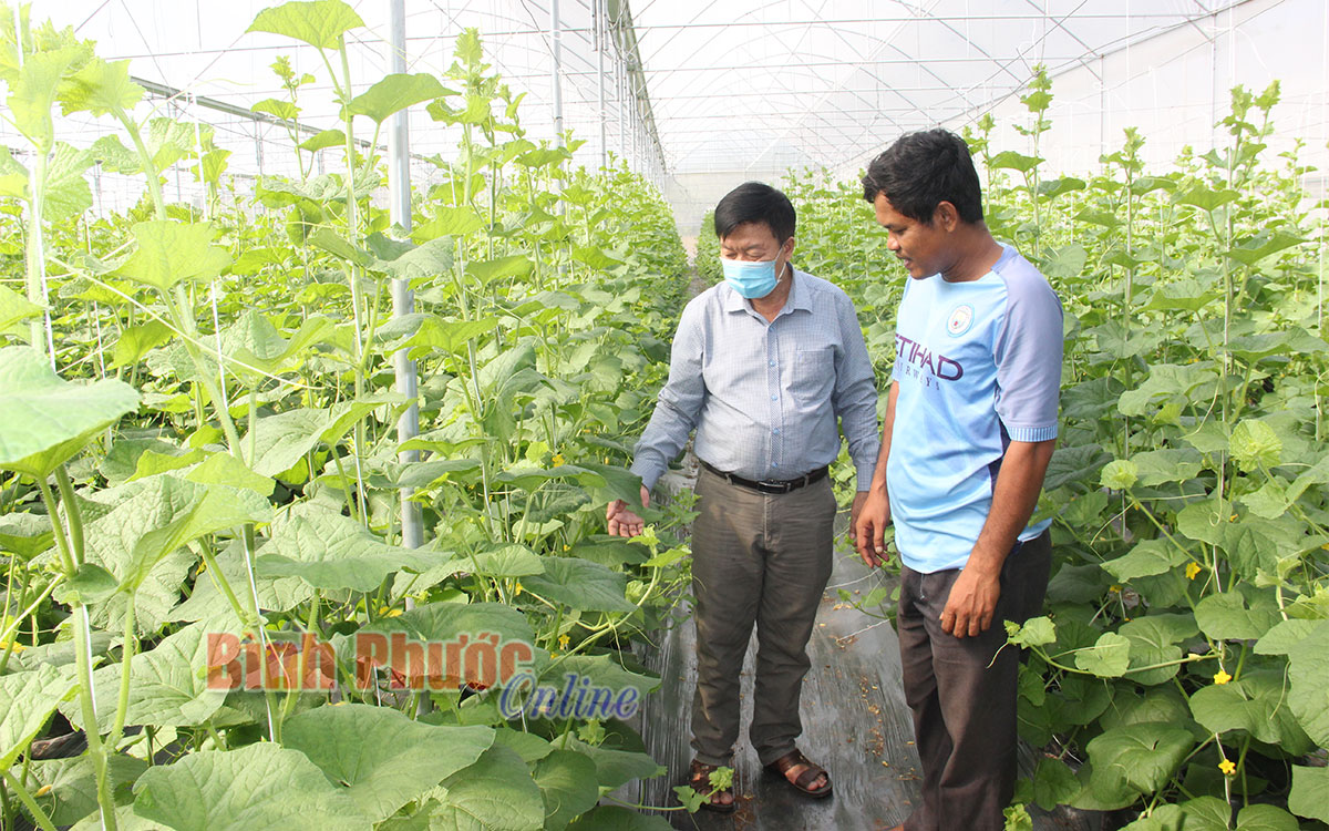 Nhờ chuyển đổi cơ cấu cây trồng, ứng dụng khoa học - kỹ thuật vào sản xuất đã giúp các hộ dân tộc thiểu số có thu nhập cao. Trong ảnh: Cán bộ Hội Nông dân huyện Lộc Ninh thăm mô hình trồng dưa lưới của gia đình anh Lâm Nhanh ở xã Lộc Hưng (ảnh chụp trước ngày 27-4-2021)