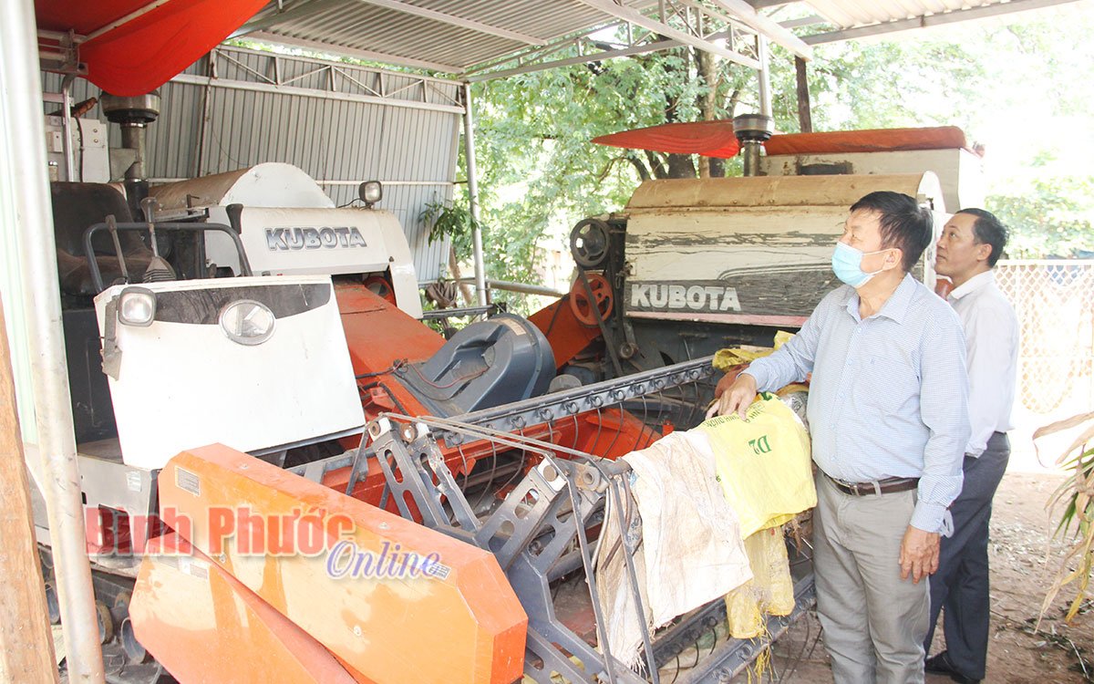 Cán bộ Hội Nông dân huyện Lộc Ninh, xã Lộc Hòa tham quan thiết bị cơ giới hóa của gia đình anh Điểu Ngân, ấp 8B