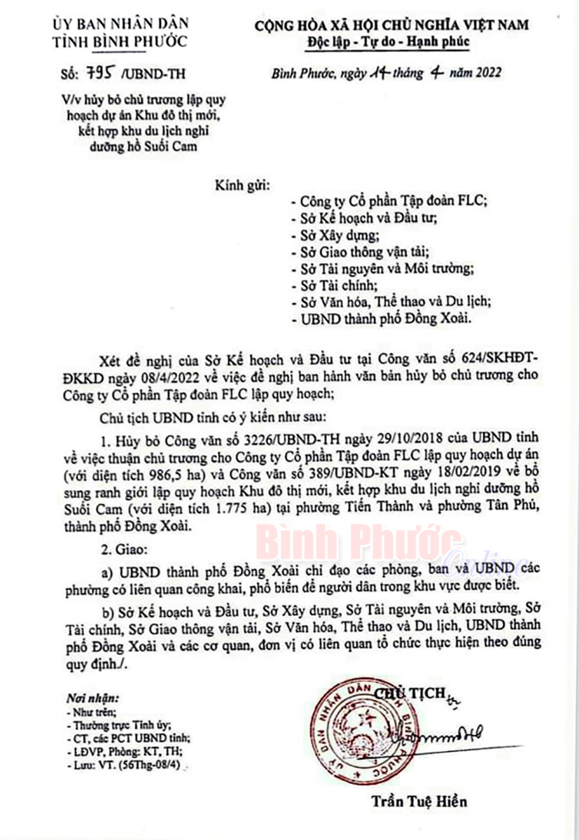 Hủy bỏ Công văn số 3226/UBND-TH ngày 29-10-2018 của UBND tỉnh về việc thuận chủ trương cho Công ty cổ phần Tập đoàn FLC lập quy hoạch dự án với diện tích 986,5 ha và Công văn số 389/UBND-KT ngày 18-2-2019 về bổ sung ranh giới lập quy hoạch khu đô thị mới kết hợp nghỉ dưỡng hồ Suối Cam với diện tích 1.775 ha tại phường Tiến Thành và phường Tân Phú, thành phố Đồng Xoài.