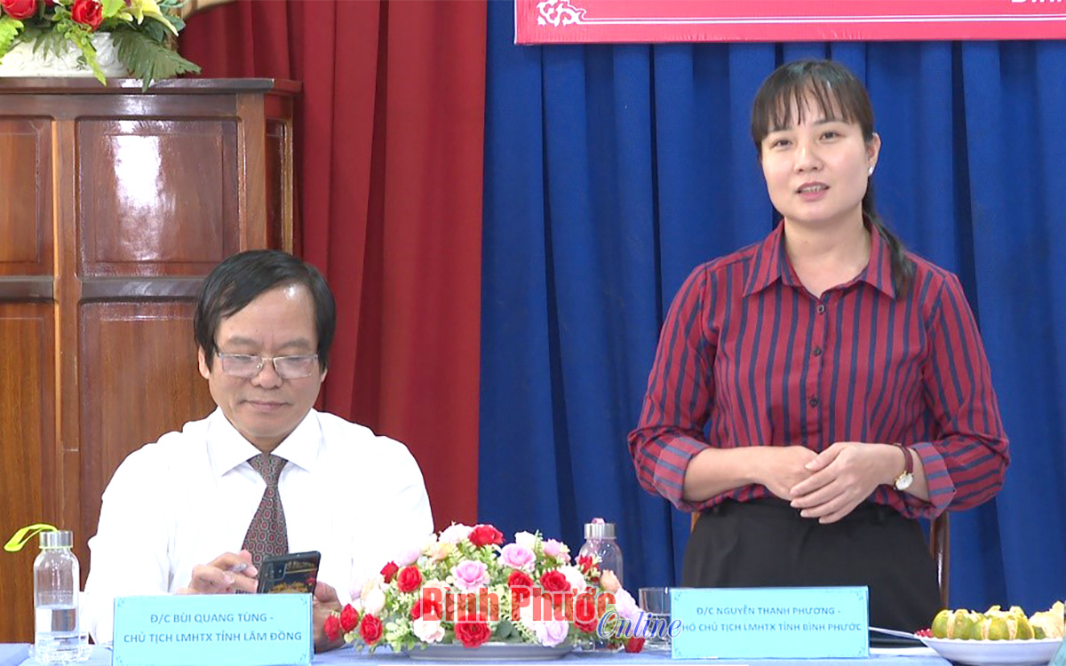 Bà Nguyễn Thanh Phương, Phó chủ tịch Liên minh Hợp tác xã tỉnh Bình Phước chia sẻ các vấn đề liên quan đến hợp tác (phát triển kinh tế hợp tác xã) giữa 2 đơn vị trong thời gian tới