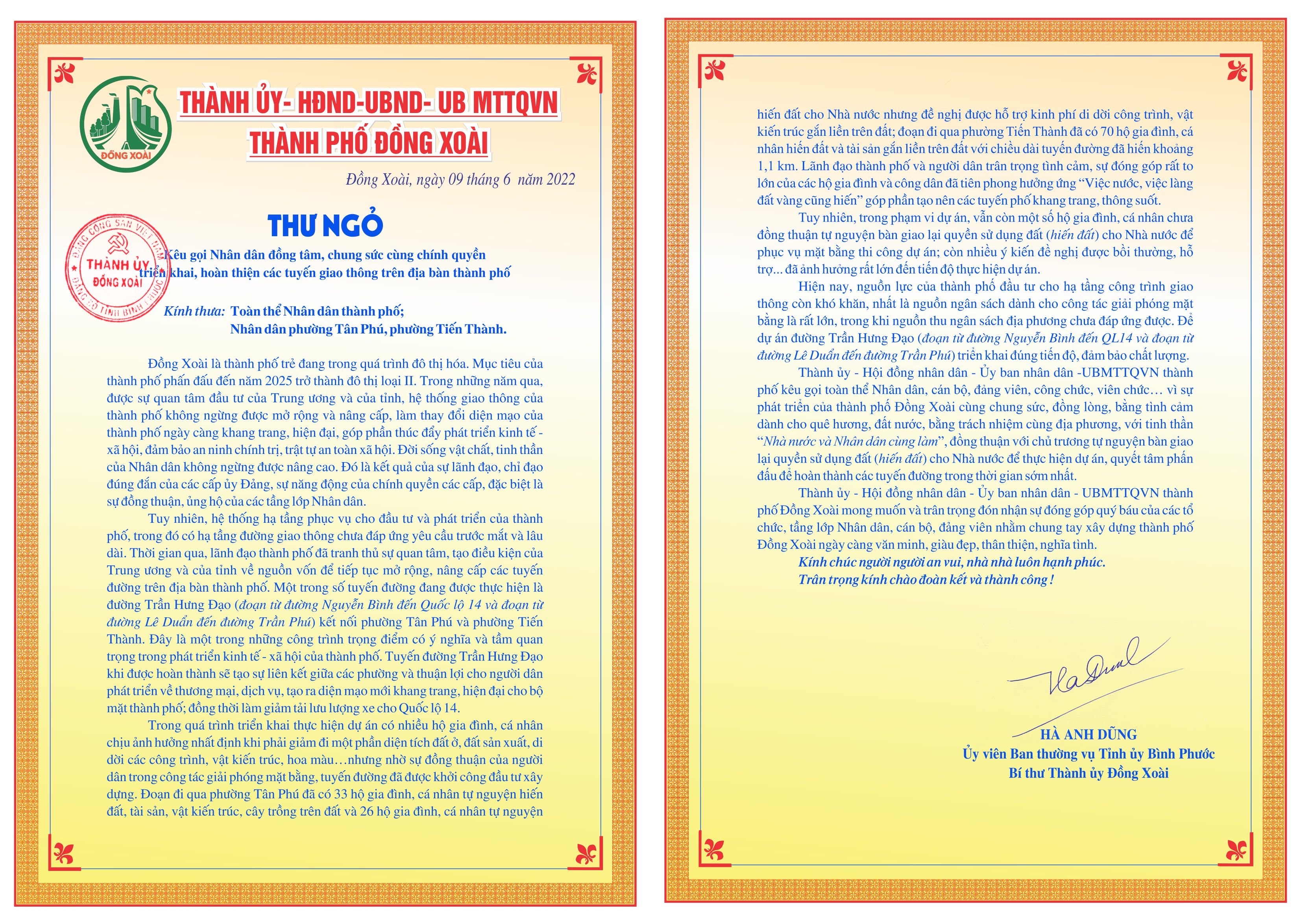 Thành ủy - HĐND - UBND - Ủy ban MTTQ Việt Nam thành phố kêu gọi toàn thể nhân dân, cán bộ, đảng viên, công chức, viên chức... vì sự phát triển của thành phố Đồng Xoài cùng chung sức, đồng lòng, bằng tình cảm dành cho quê hương, đất nước, bằng trách nhiệm cùng địa phương, với tinh thần “Nhà nước và Nhân dân cùng làm”, đồng thuận với chủ trương tự nguyện bàn giao lại quyền sử dụng đất (hiến đất) cho nhà nước để thực hiện dự án, quyết tâm phấn đầu để hoàn thành các tuyến đường trong thời gian sớm nhất.
