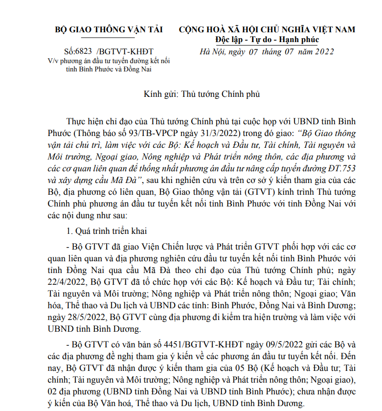 Trong công văn, Bộ GT-VT đã báo cáo quá trình triển khai thực hiện chỉ đạo của Thủ tướng Chính phủ về việc thống nhất phương án đầu tư nâng cấp tuyến đường ĐT.753 và xây dựng cầu Mã Đà. Cụ thể, Bộ GT-VT đã tổ chức họp với các bộ Kế hoạch và Đầu tư, Tài chính, Tài nguyên và Môi trường, Nông nghiệp và Phát triển nông thôn, Ngoại giao, Văn hóa - Thể thao và Du lịch, UBND các tỉnh Bình Phước, Đồng Nai, Bình Dương và cùng các địa phương đi kiểm tra hiện trường.