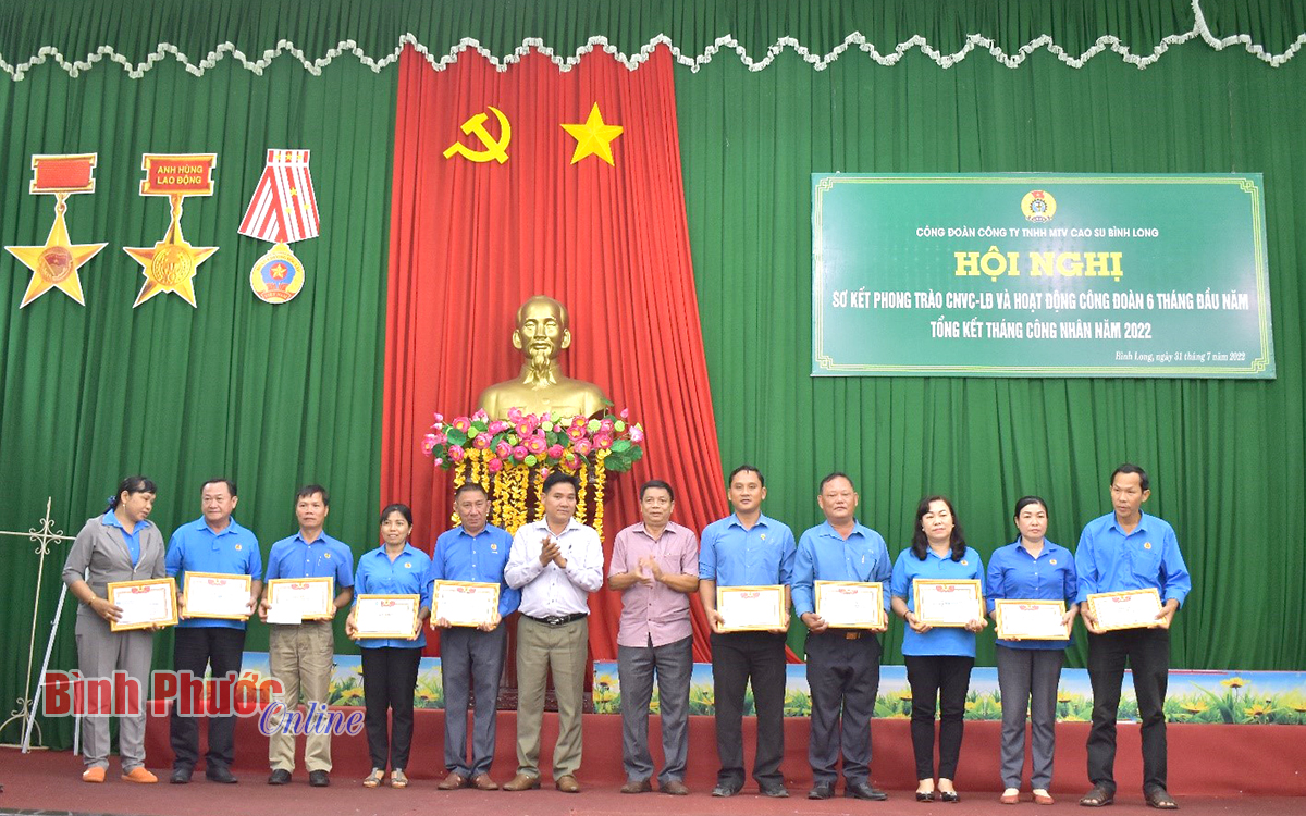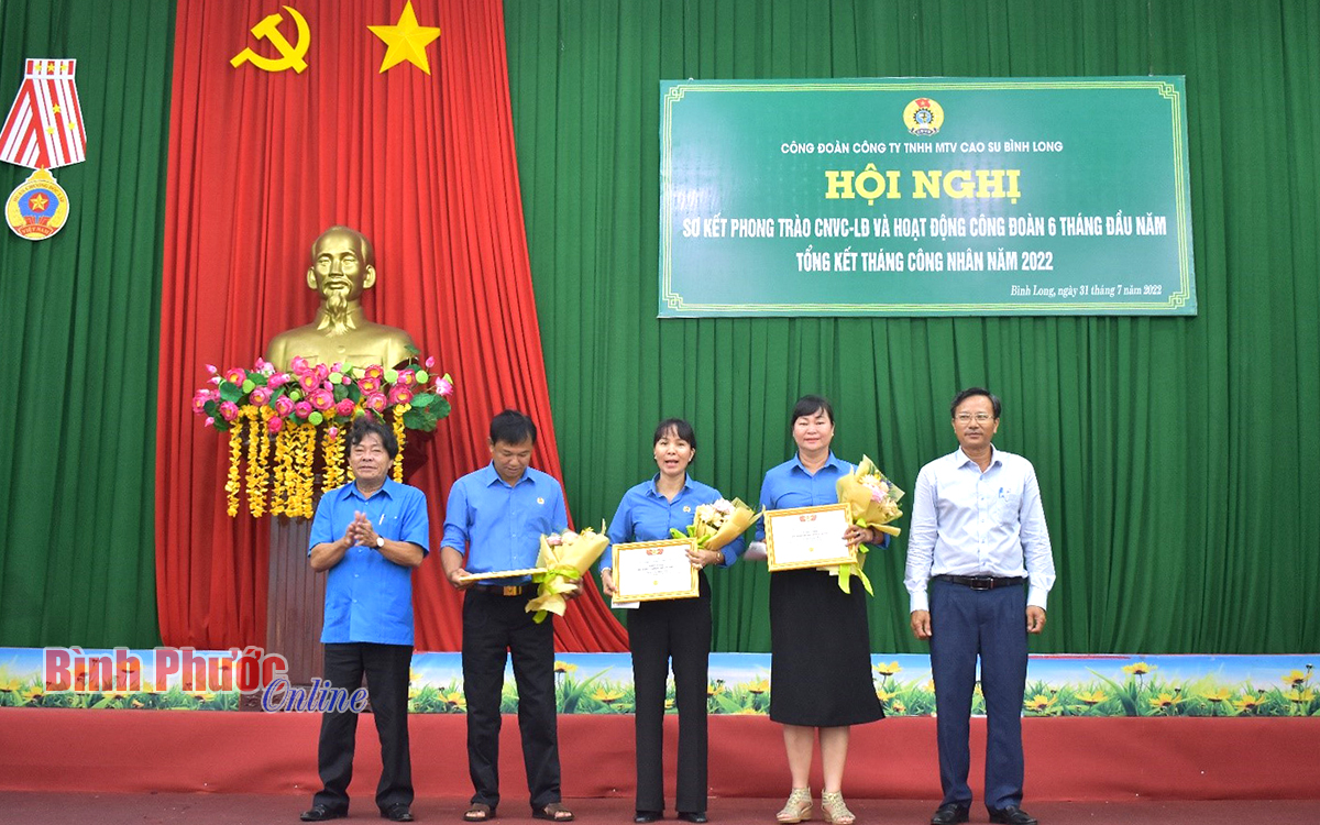 Dịp này, 3 cá nhân được tặng kỷ niệm chương “Vì sự nghiệp xây dựng tổ chức Công đoàn Việt Nam”; 16 tập thể, 1 cá nhân có thành tích xuất sắc trong hoạt động công đoàn và tham gia chương trình “1 triệu sáng kiến” đã được Tập đoàn, Công đoàn Cao su Việt Nam, Công đoàn Công ty TNHH MTV Cao su Bình Long tặng bằng khen, giấy khen.