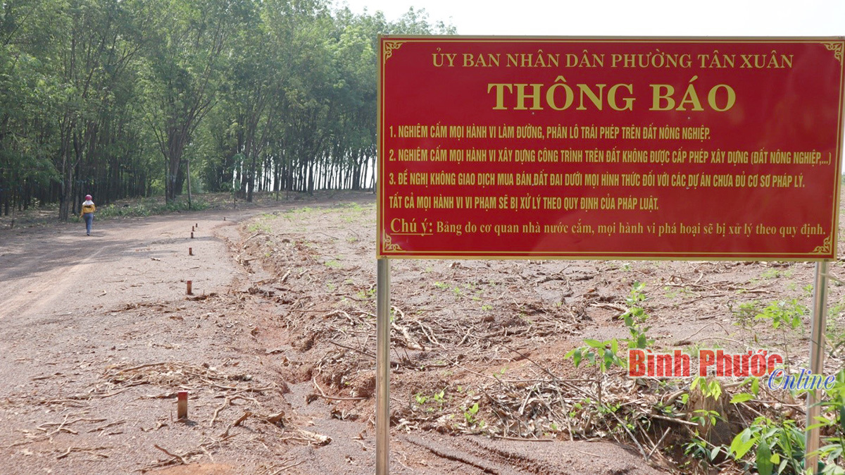 Chính quyền địa phương cảnh báo người dân trước tình trạng phân lô bán nền tràn lan. Trong ảnh: Phường Tân Xuân, thành phố Đồng Xoài cắm bảng cảnh báo người dân tại các điểm nóng phân lô, tách thửa