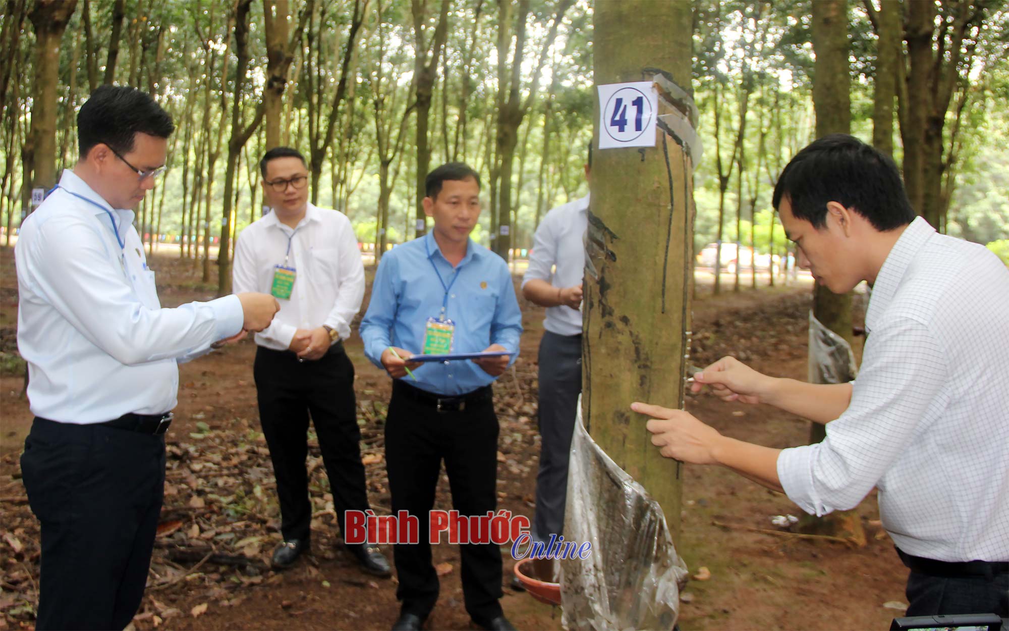 Ban giám khảo chấm kỹ thuật cạo mủ trên cây của các thí sinh