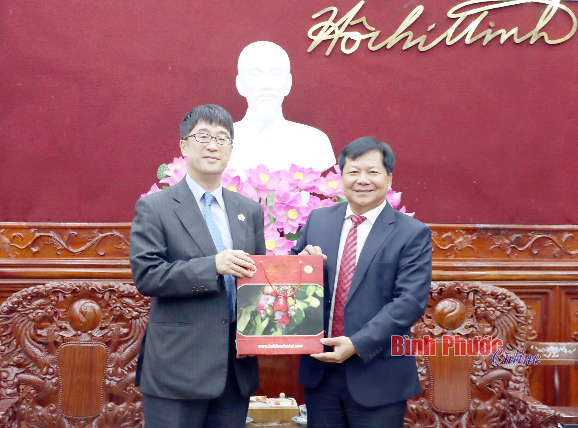 Phó Chủ tịch UBND tỉnh Trần Văn Mi và ông Matsumoto Nobuyuki trao tặng đặc sản của địa phương gồm sản phẩm hạt điều Bình Phước và quả lê - một sản phẩm nổi tiếng của Nhật Bản