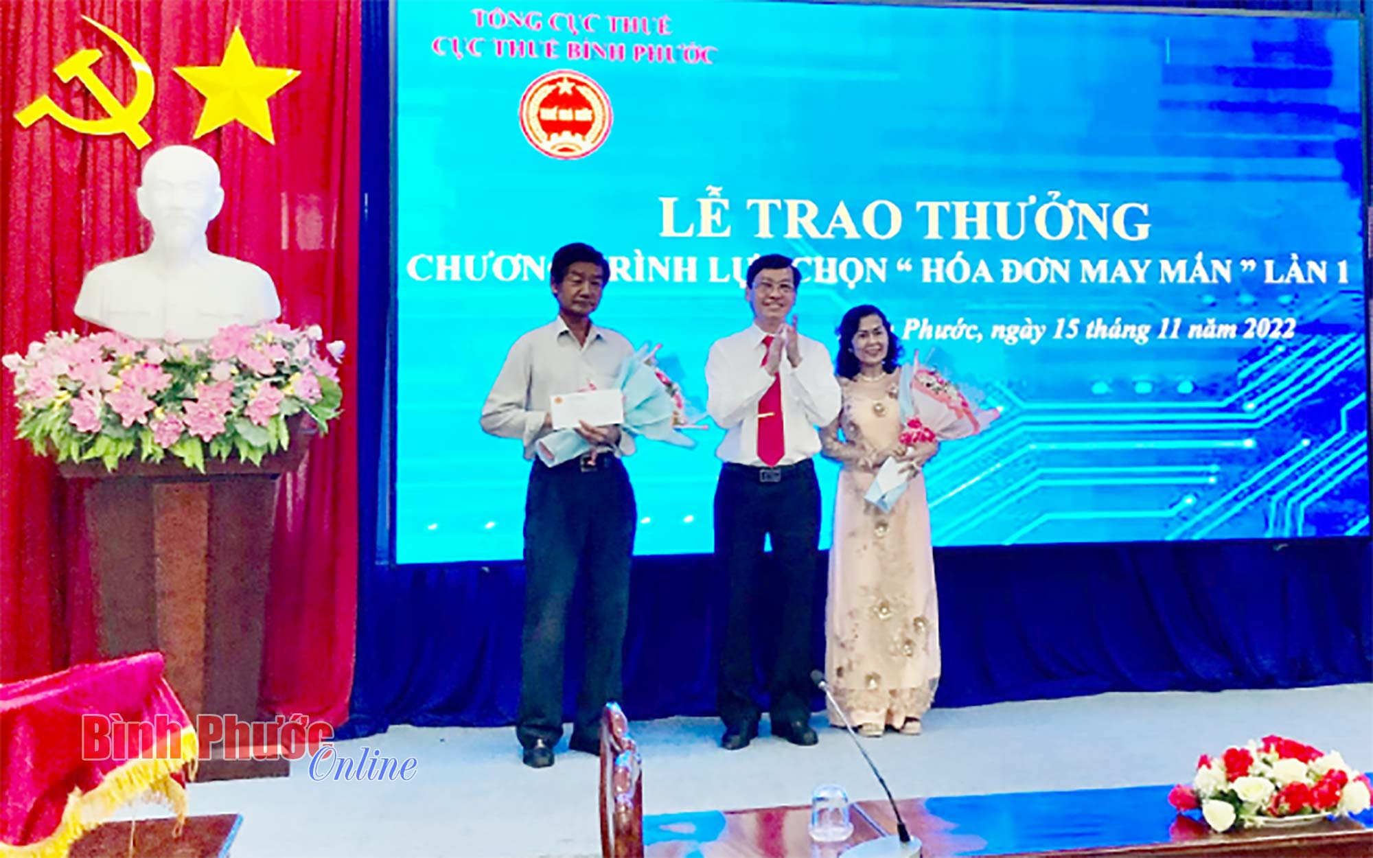Ông Lâm Văn Đạt, Cục trưởng Cục Thuế Bình Phước trao thưởng cho các cá nhân trúng thưởng Chương trình lựa chọn “Hóa đơn may mắn” trên địa bàn tỉnh, đợt 1/2022