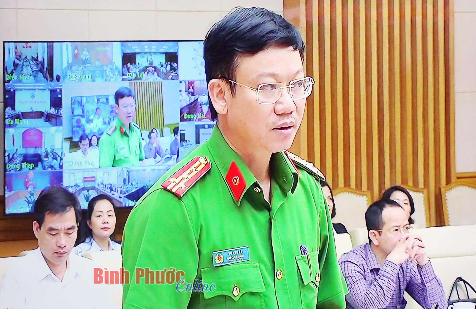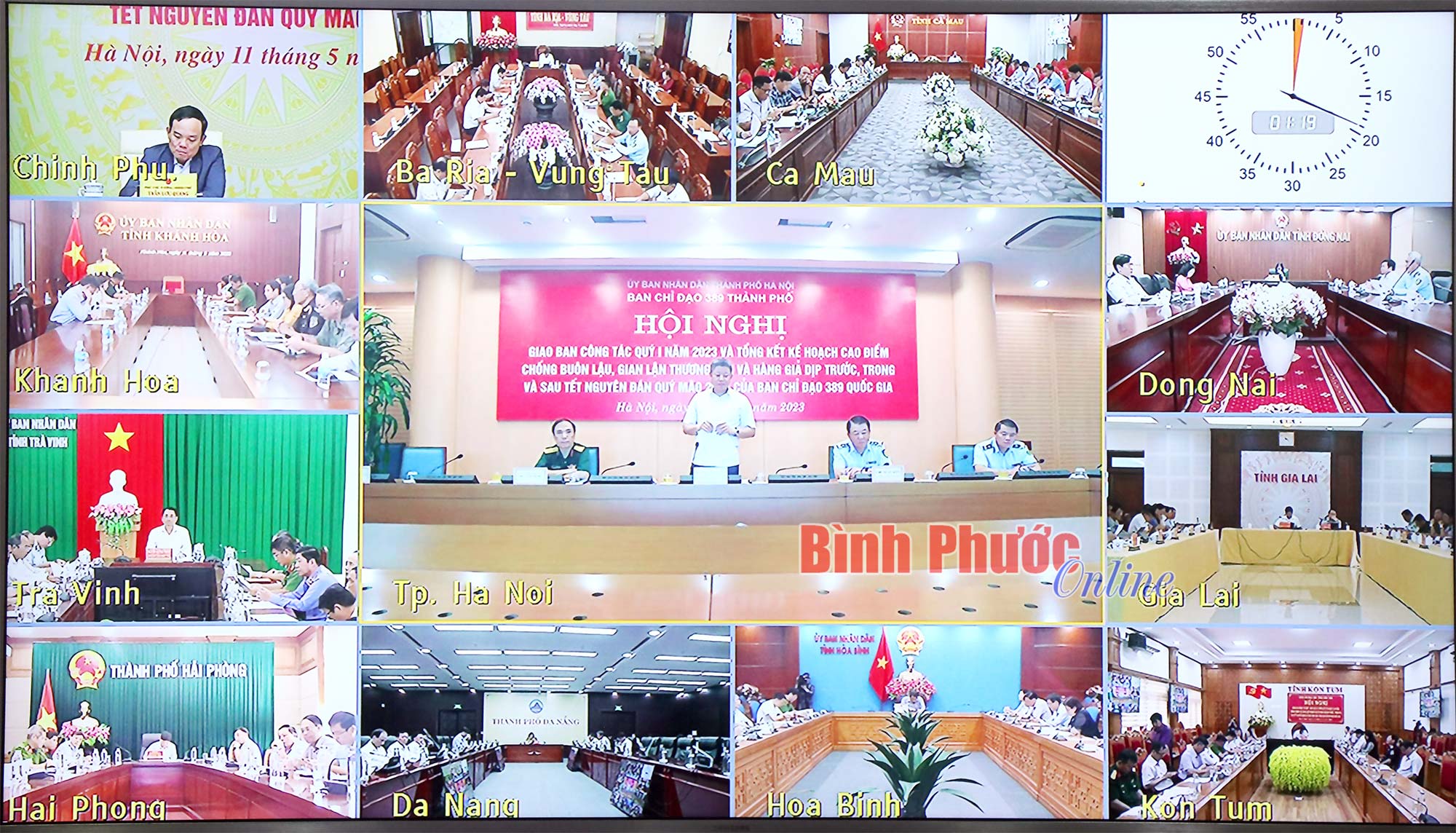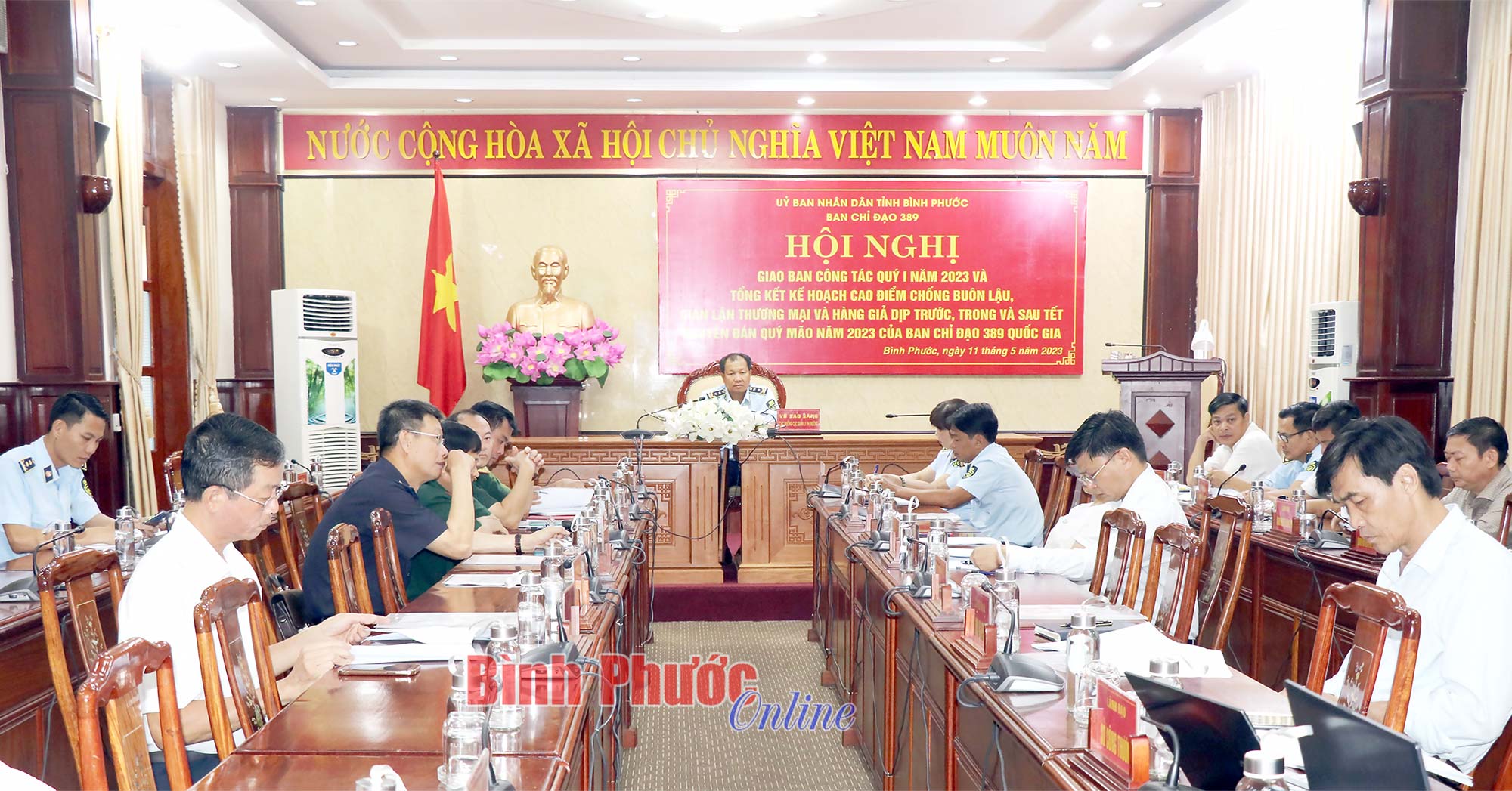 Cục trưởng Cục Quản lý thị trường tỉnh Vũ Sao Sáng và các thành viên Ban Chỉ đạo 389 tỉnh tham dự hội nghị tại điểm cầu Bình Phước