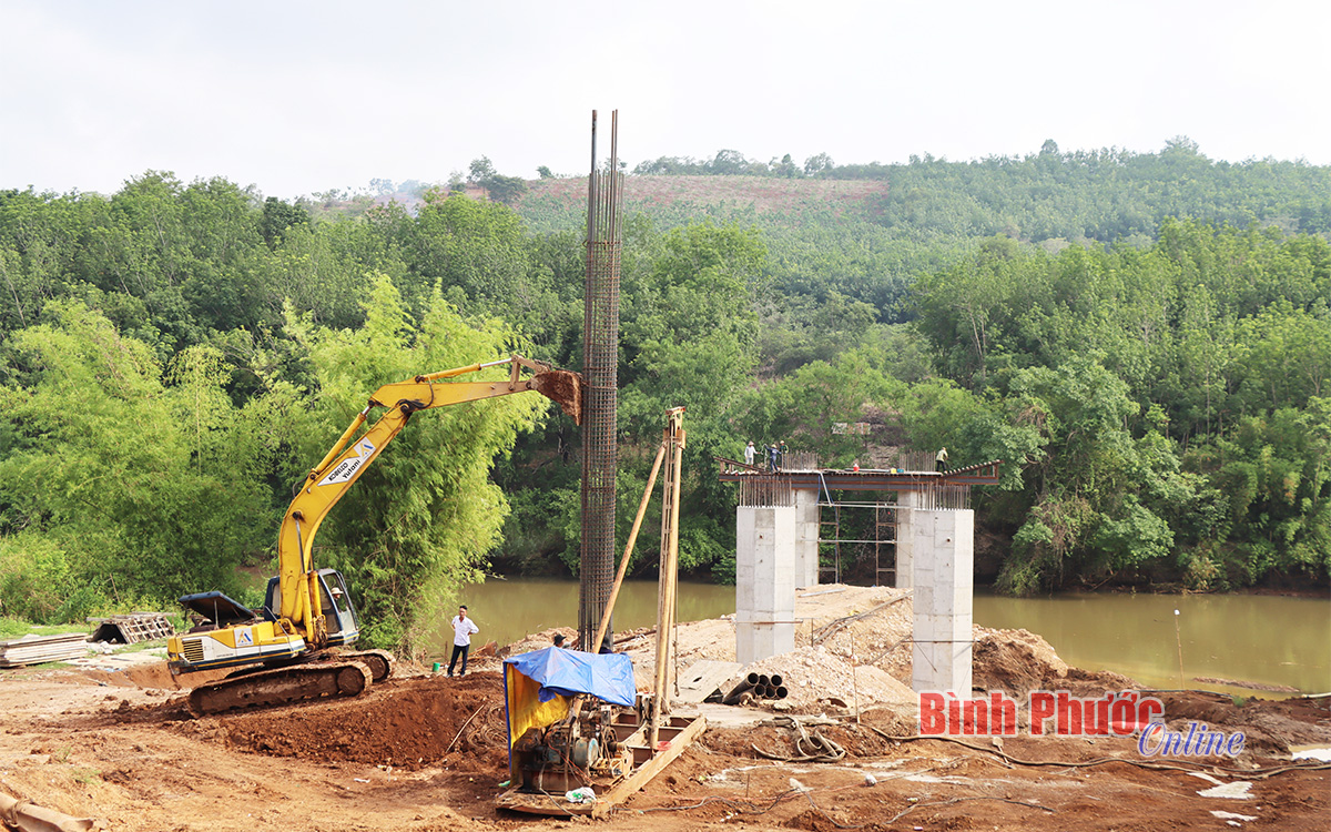 Đoàn khảo sát tại công trình xây dựng cầu bắc qua Sông Bé (nối thị xã Phước Long với huyện Bù Gia Mập)