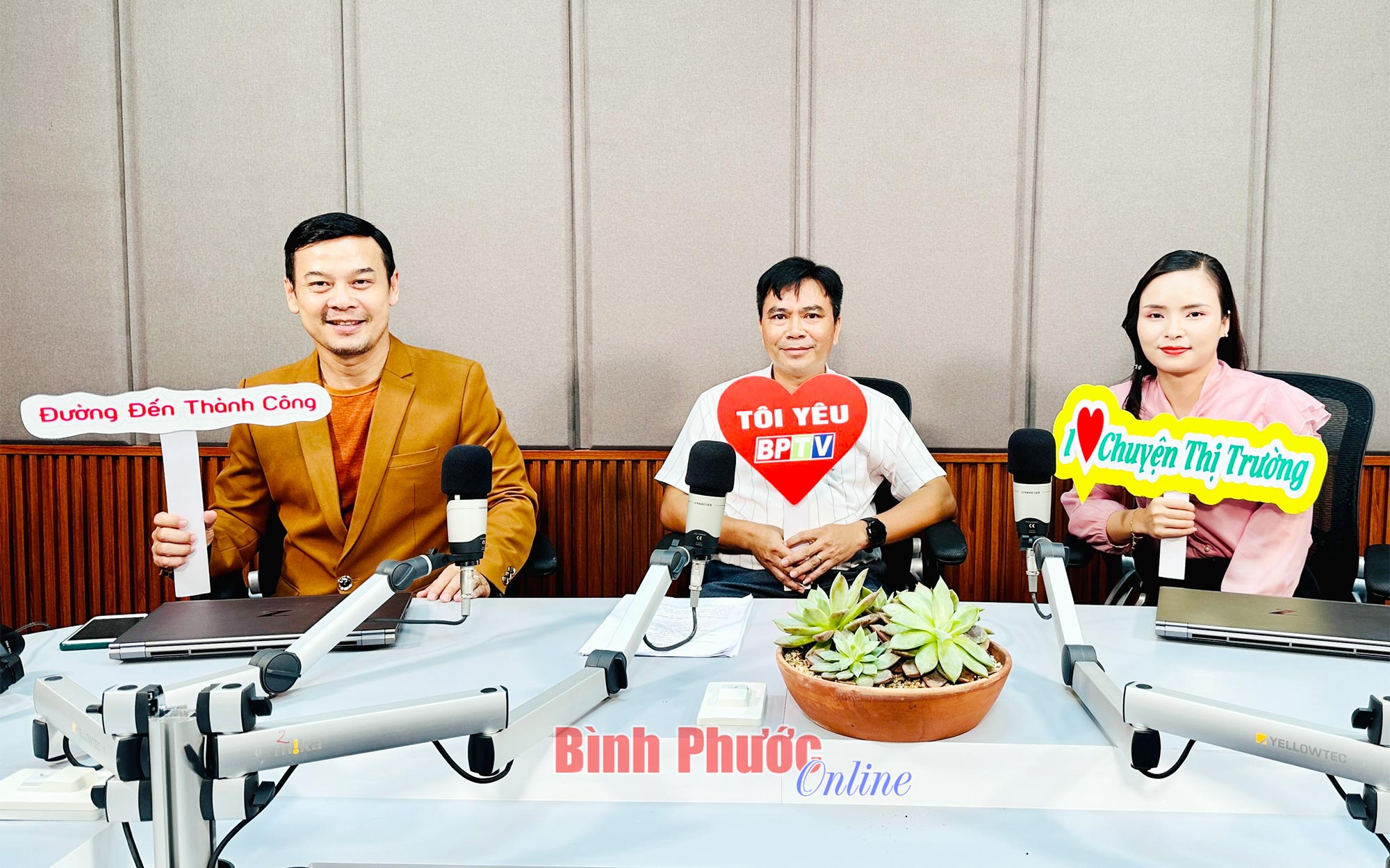 Anh Giang Công Dân (giữa), Giám đốc Công ty Á - Âu, chụp hình lưu niệm cùng 2 MC Hoài Duy - Quỳnh Như tại phòng thu của BPTV trong chương trình “Chuyện thị trường” - Ảnh: Minh Huệ