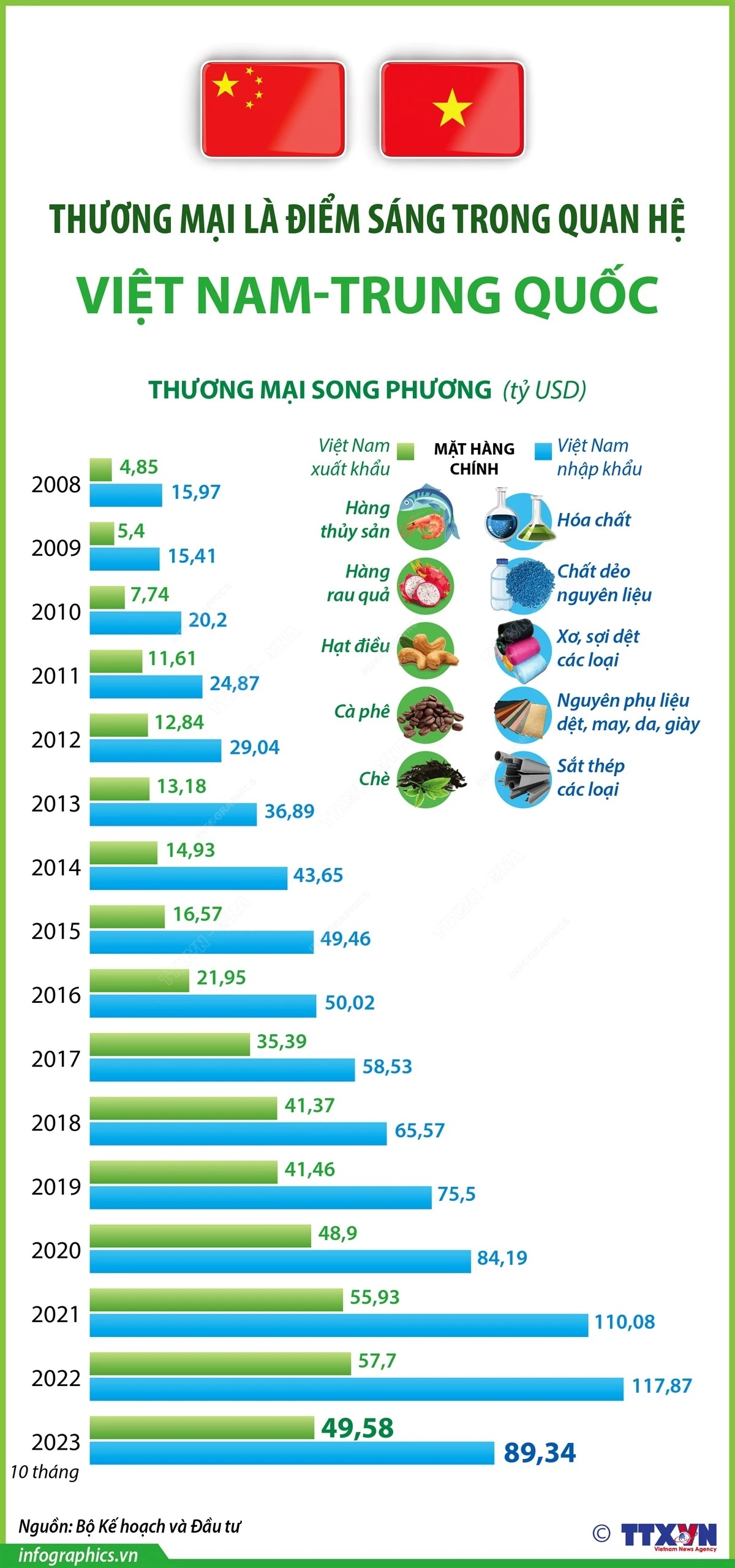 Trung Quốc hiện là đối tác thương mại lớn nhất, thị trường nhập khẩu thứ 2 của Việt Nam. Việt Nam là đối tác thương mại lớn thứ 4 (sau Hoa Kỳ, Nhật Bản, Hàn Quốc) và lớn nhất trong ASEAN của Trung Quốc.