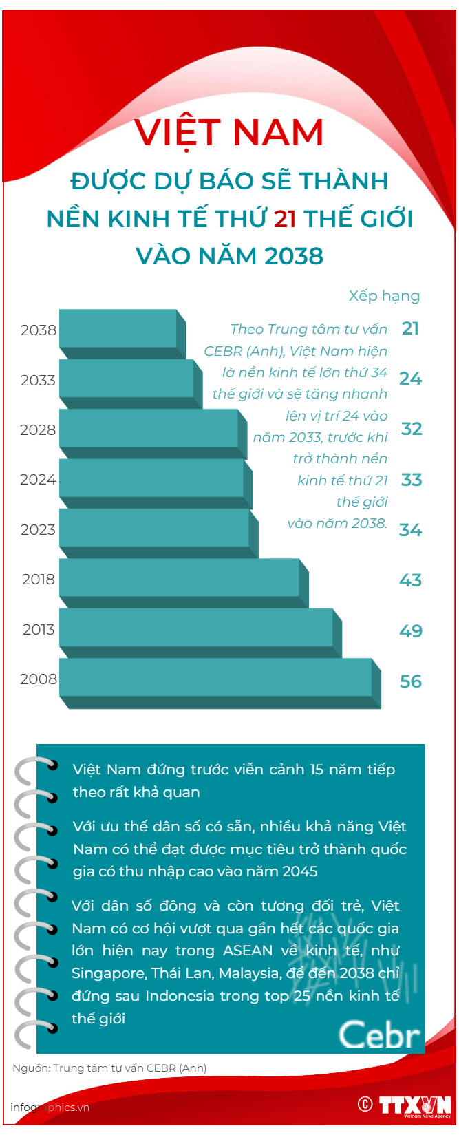 Theo CEBR, Việt Nam hiện là nền kinh tế lớn thứ 34 thế giới và sẽ tăng nhanh lên vị trí 24 vào năm 2033, trước khi trở thành nền kinh tế thứ 21 thế giới vào năm 2038.