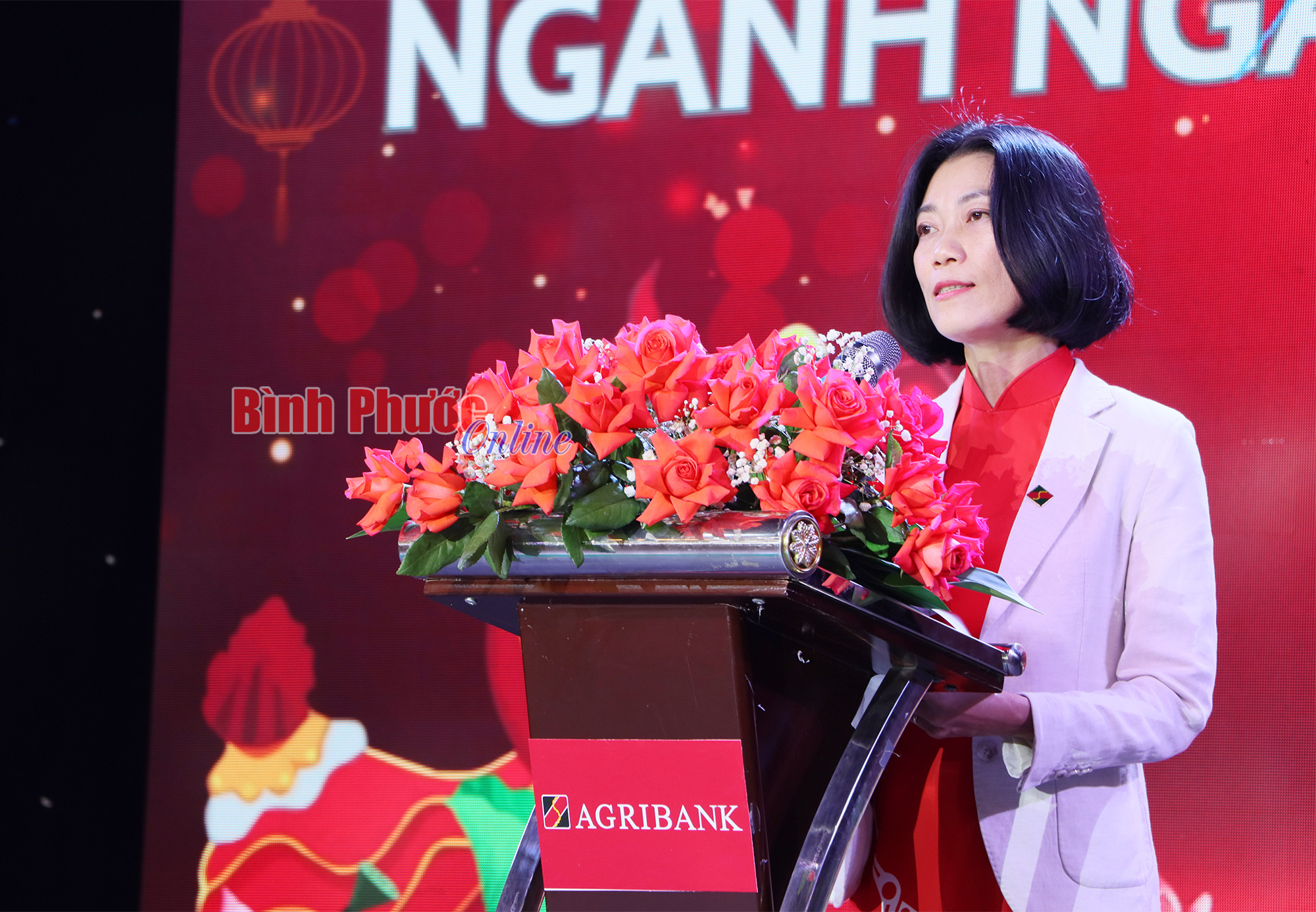 Phó Giám đốc Agribank chi nhánh Tây Bình Phước Lê Thị Thu Vân báo cáo hoạt động kinh doanh của Agribank Bình Phước và Agribank chi nhánh Tây Bình Phước tại buổi họp mặt