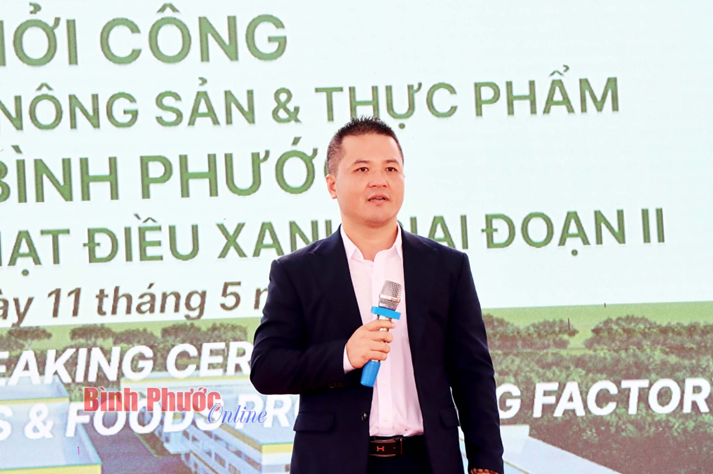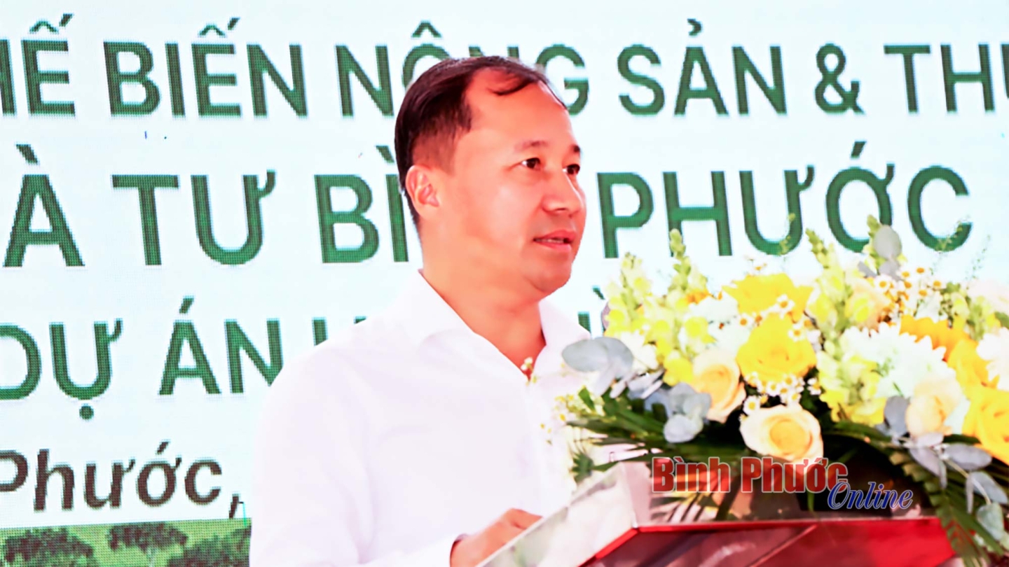 Chủ tịch UBND huyện Đồng Phú Nguyễn Anh Tuấn phát biểu tại lễ khởi công nhà máy chế biến nông sản và thực phẩm Bà Tư Bình Phước