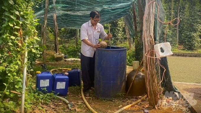 Ông Luận tận dụng các phế phụ phẩm từ nông nghiệp có tại địa phương kết hợp với men vi sinh để tạo ra các chế phẩm sinh học giàu dinh dưỡng giúp cây sinh trưởng khoẻ. Ảnh: Trần Trung